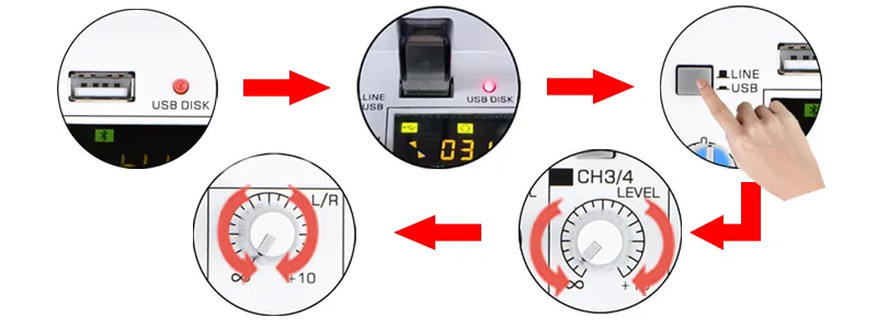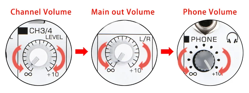 Gire la perilla de volumen del canal 3/4 para ajustar el volumen de salida del canal.
