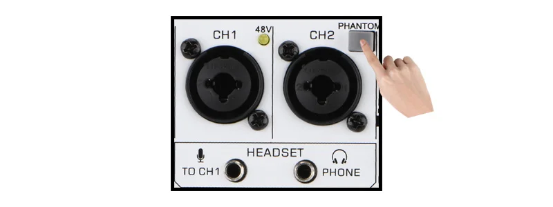 2. Encienda + 48V phantom power para suministrar la energía al micrófono condensador.