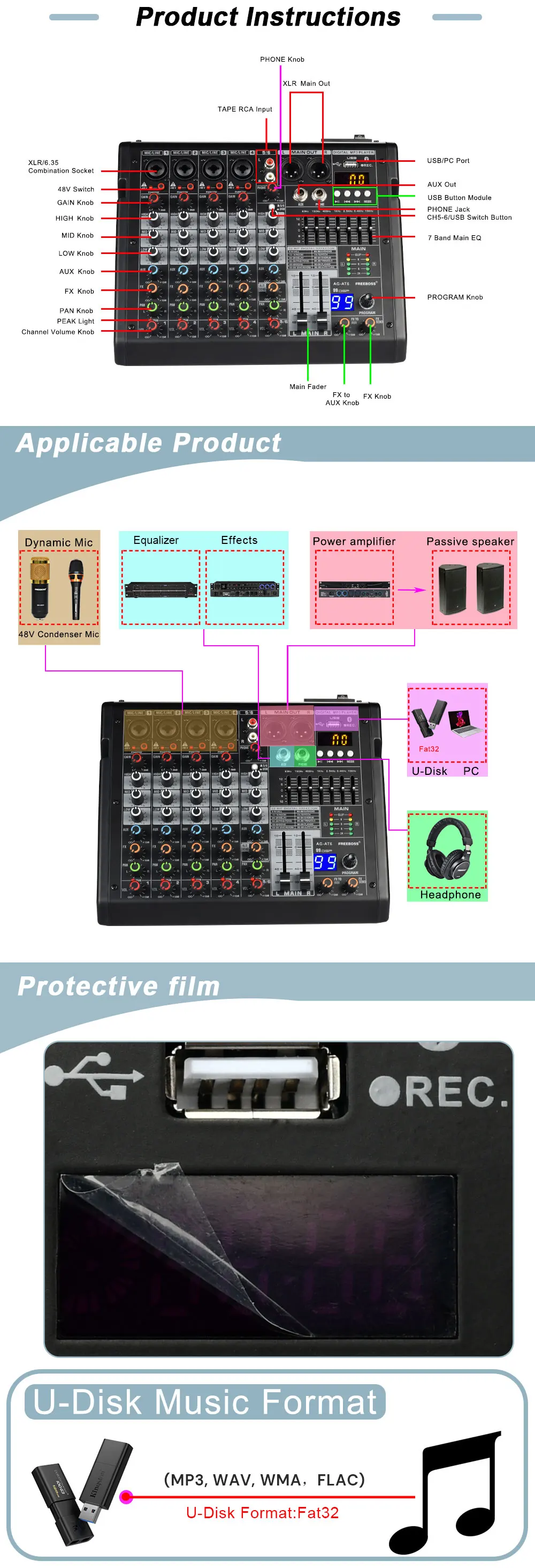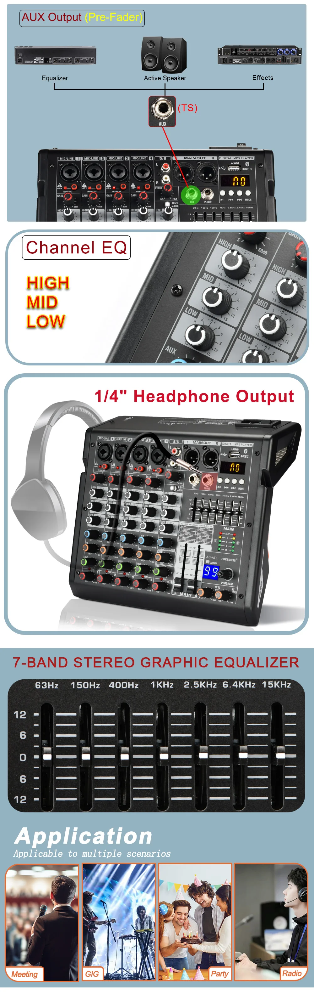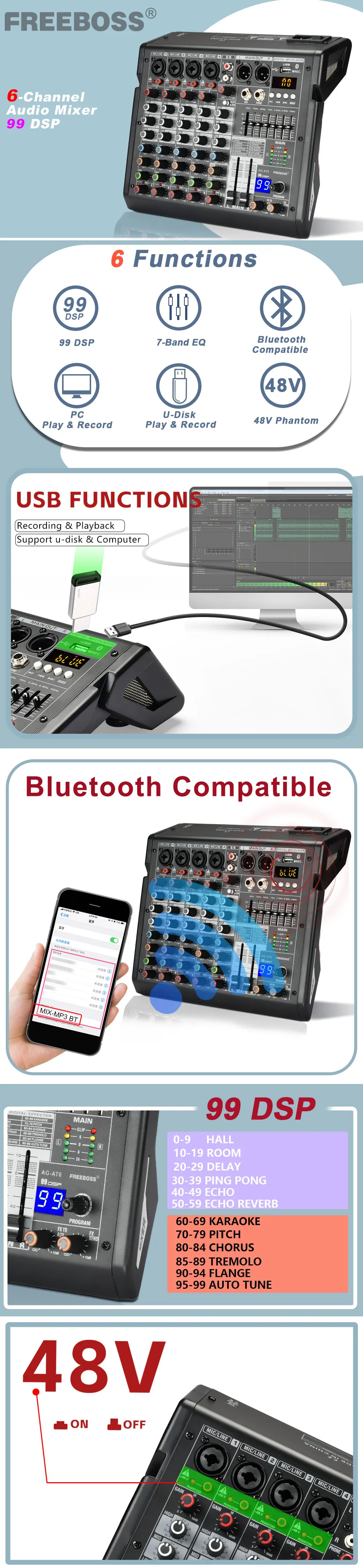 Freeboss-Mezclador de audio Bluetooth de 6 canales, 7 bandas, estéreo, EQ 99 DSP, efectos, mezclador de sonido por separado, 48V phantom power, USB, PC, reproducción de grabación, consola de mezcla PARA KARAOKE, Reunión, fiesta en casa, radio.