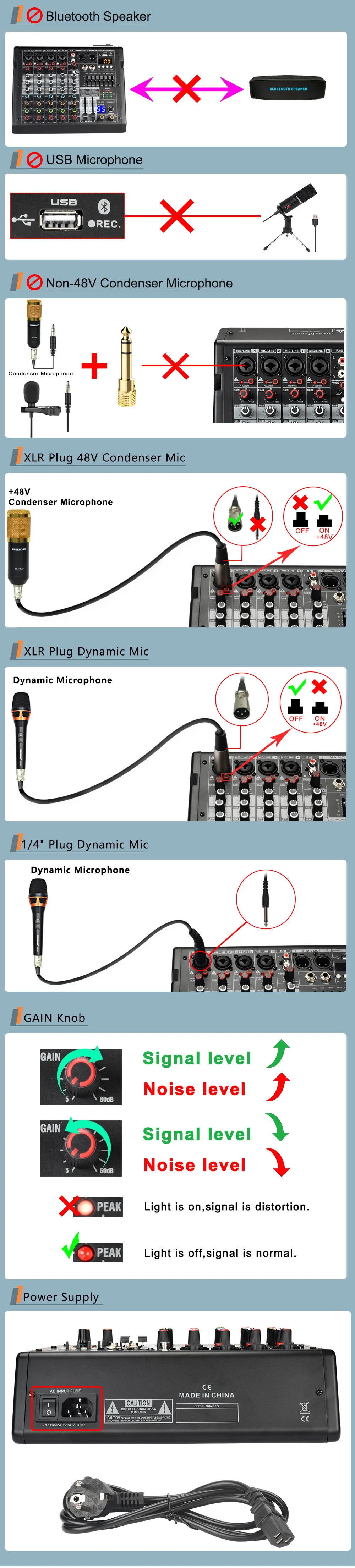 Tenga en cuenta:Micrófono de 48V + Entrada de enchufe 6,35, el micrófono no puede funcionar.