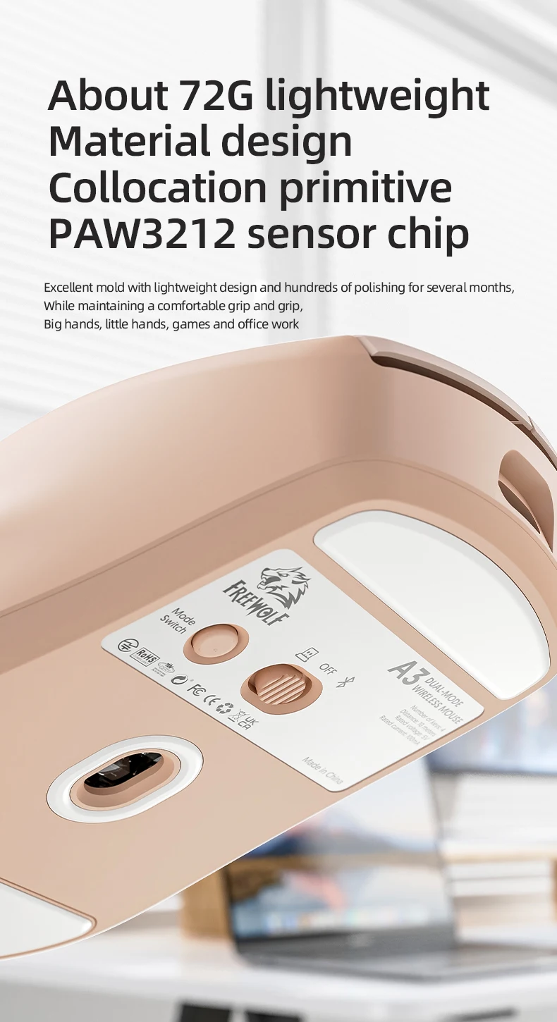 ----2.FREEWOLF A3 mouse is the upgraded version of X7 mouse, optimizing the size and weight to make it a lightweight mouse, with a net weight of about 75g excluding the box, and at the same time, optimizing the appearance and material for a more ergonomic fit to the skin and curve of the palm, and a stronger grip.