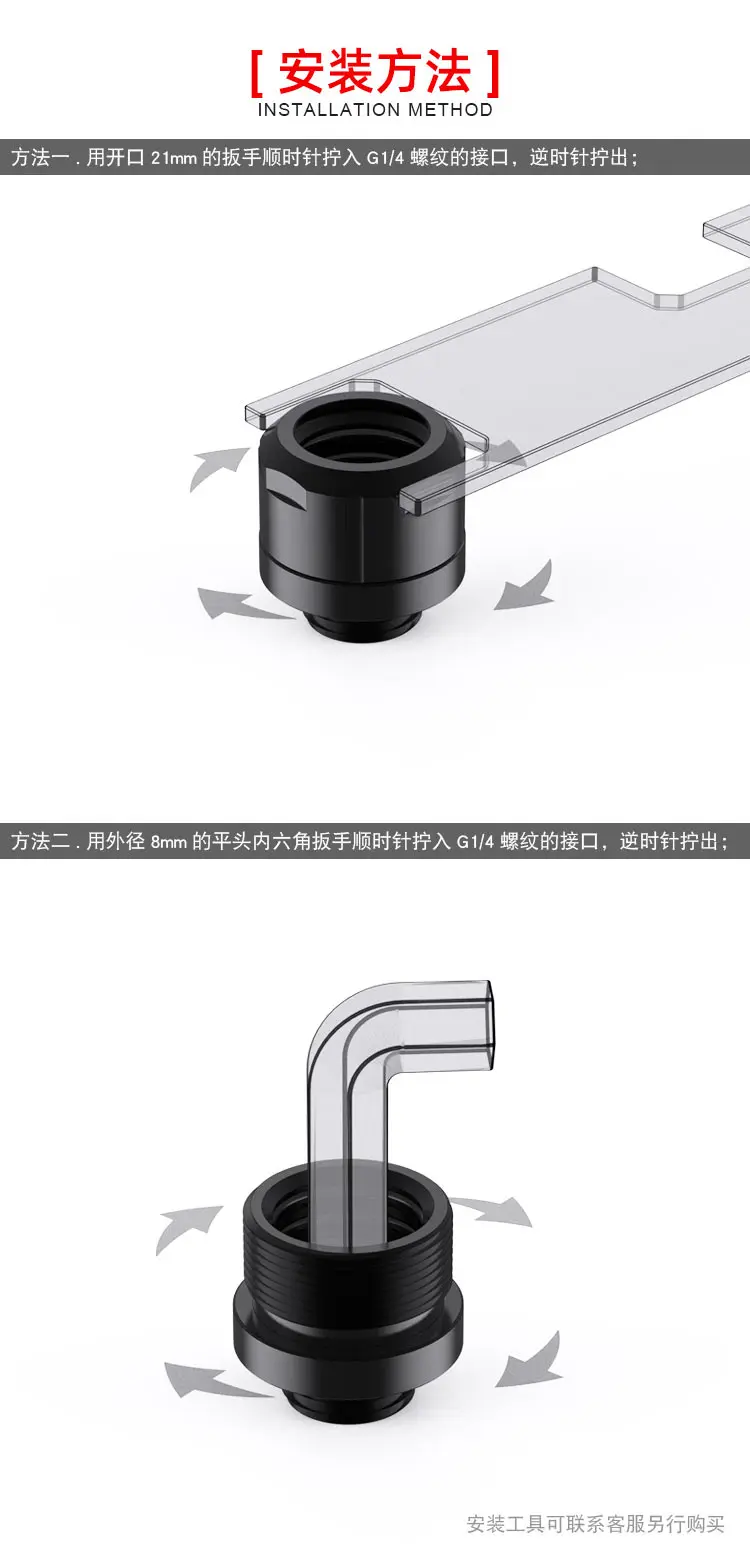 Tamaño:Con una altura de 22,7mm (incluida la rosca) y un diámetro de 21mm, admite tubos duros PETG/PMMA con un diámetro exterior de 14mm.