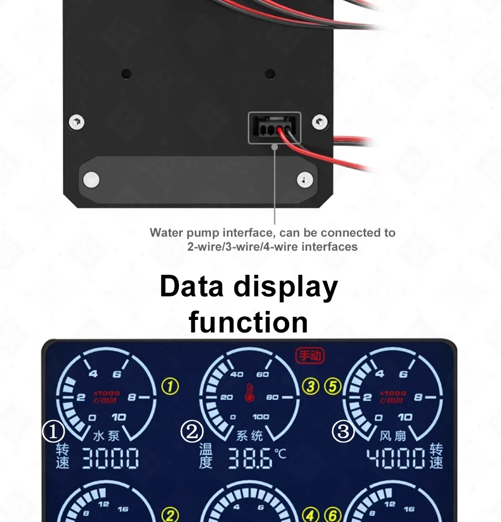 4 actual:El valor actual de la bomba de agua y el ventilador, que oscila entre 0 y 10 A.La corriente de la bomba de agua es ≤ 3A y la corriente total de los seis ventiladores es ≤ 6A