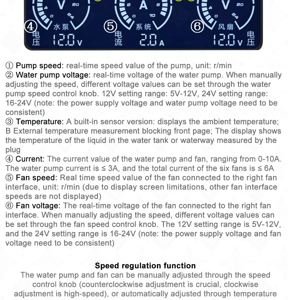 2 Voltaje de la bomba de agua:voltaje en tiempo real de la bomba de agua.Al ajustar manualmente la velocidad, se pueden configurar diferentes valores de voltaje a través de la perilla de control de velocidad de la bomba de agua.Rango de configuración de 12 V: 5 V-12 V, rango de configuración de 24 V: 16-24 V (nota: el voltaje de la fuente de alimentación y el voltaje de la bomba de agua deben ser consistentes)