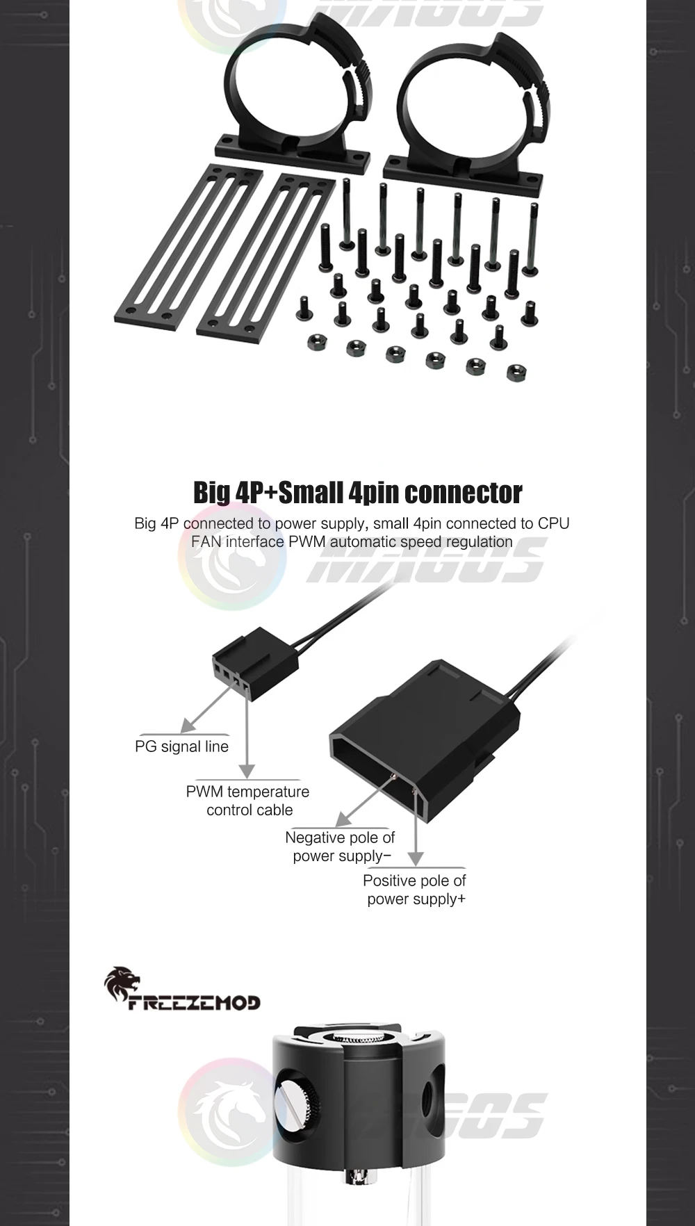 Power connector: large 4P (connect power supply) + small 4 pin (connect motherboard, support PWM speed control)