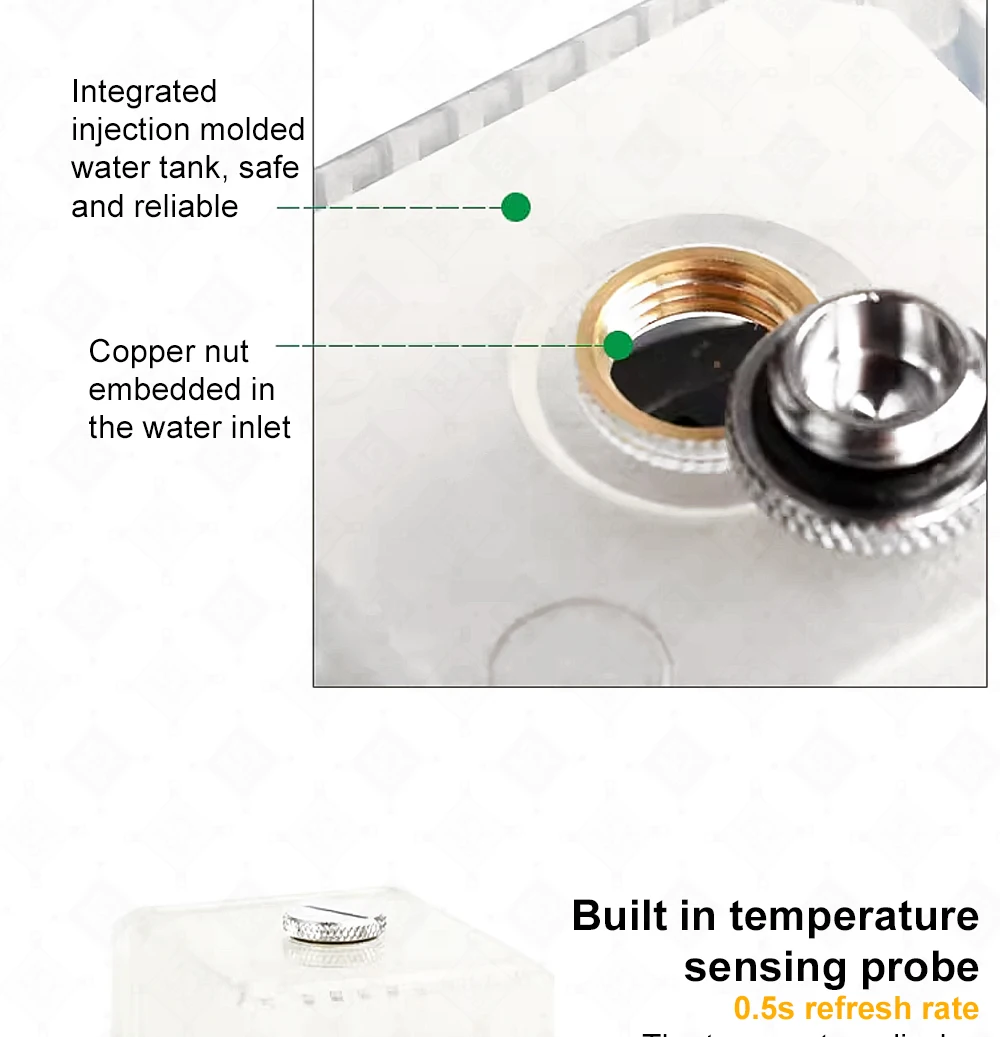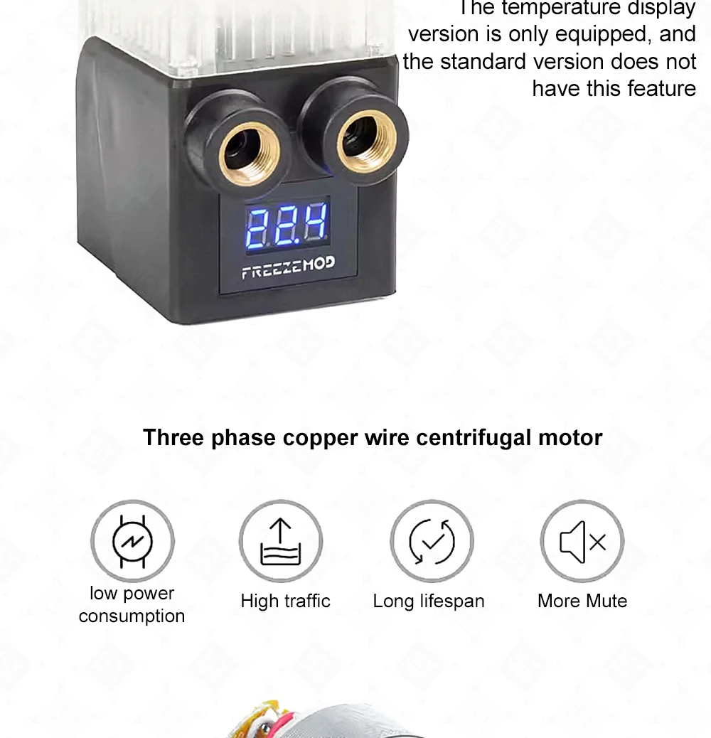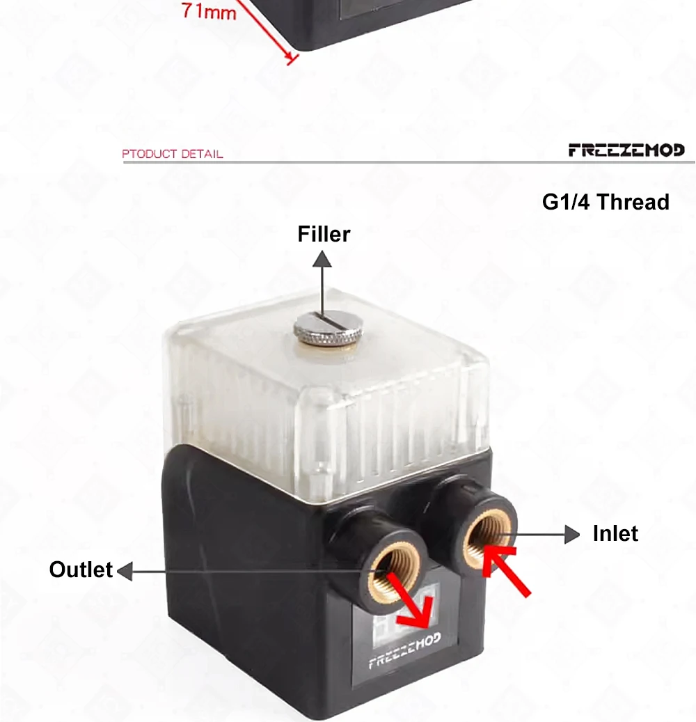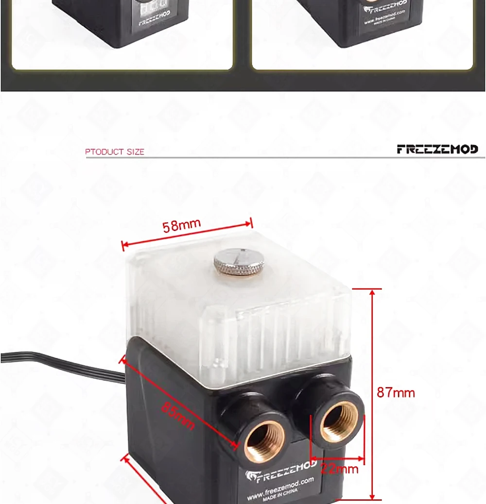 Modelo: PUB-12WX450L Material: PC + ABS + cobre Interfaz: G1/4*3 Temperatura: menos de 60 ℃ Tamaño: 85mm * 58mm * 87mm Peso: 325g/330g (con versión de visualización de temperatura) Longitud de la línea: 50cm Accesorio: almohadilla amortiguadora de goma * 1 tornillo de instalación * 4 Velocidad de carga: 6000RPM +-10% Corriente: 0,55A +-10% Potencia: 5W ± 10% Voltaje de arranque: 6V Cabezal de bomba de agua: 3 metros Caudal de la bomba de agua: 450LH Nivel de protección contra descargas eléctricas: Clase 2