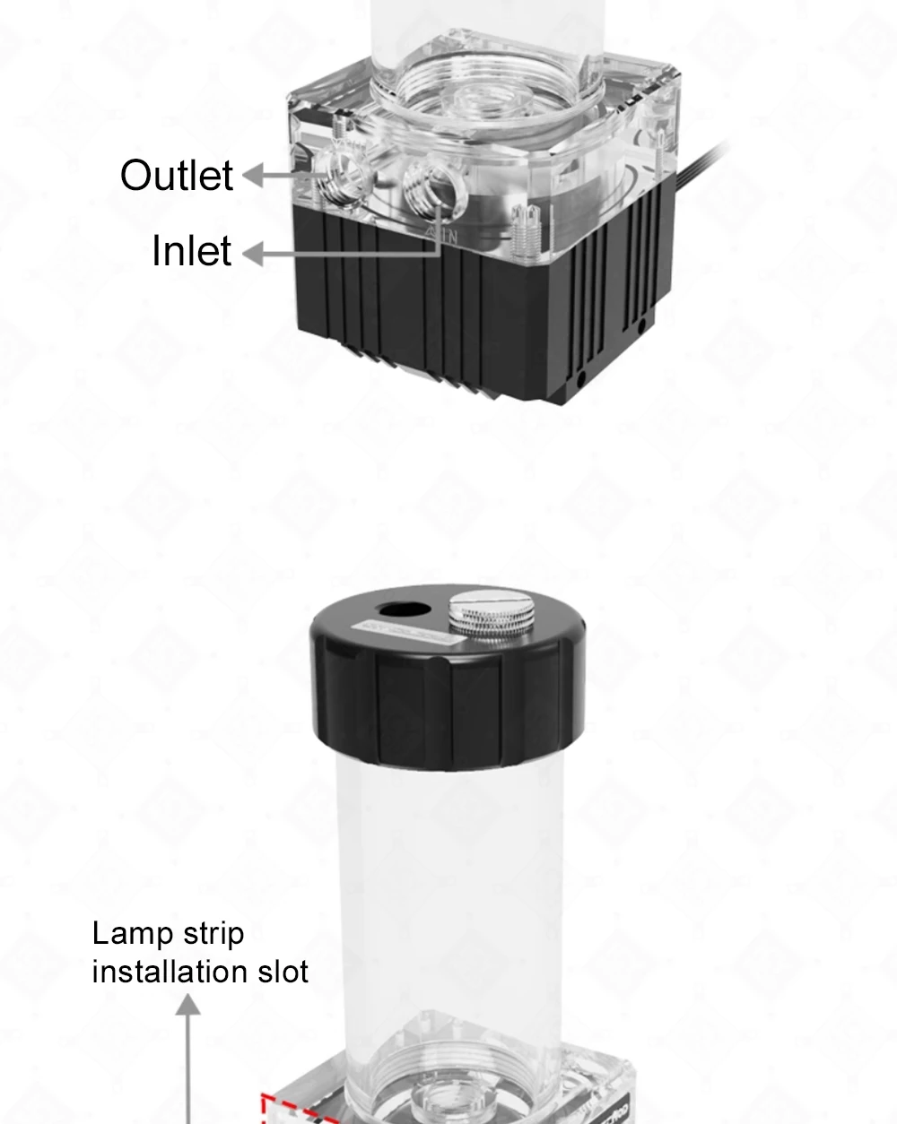 Modelo: PUB-GCDCA2 Material: acrílico + POM + aleación de aluminio Posición del agujero: G1/4*4 Diámetro exterior del tanque de agua: cuerpo del tubo 50mm, cubierta 59mm. Altura: 122mm/172mm/222mm/272mm/322mm/372mm Capacidad: 62,8 ml/125ml/188ml/251ml/314ml/376ml Accesorio: Hebilla tipo I * 2, hebilla ajustable ABS * 2, enchufe * 1, tornillo * 24, almohadilla amortiguadora * 1, anillo de sellado de repuesto * 2