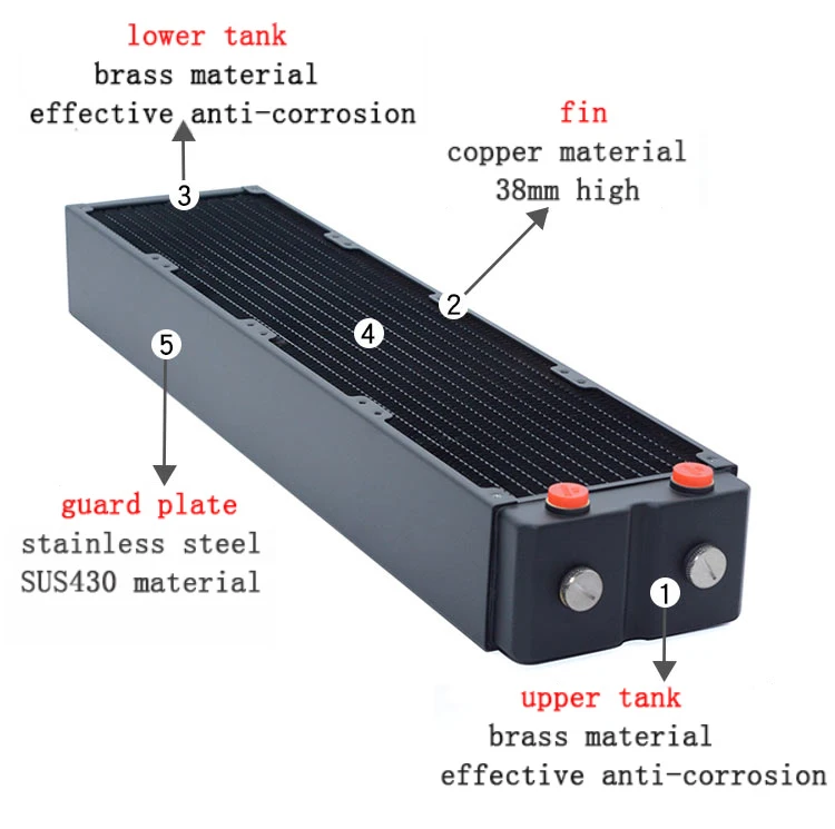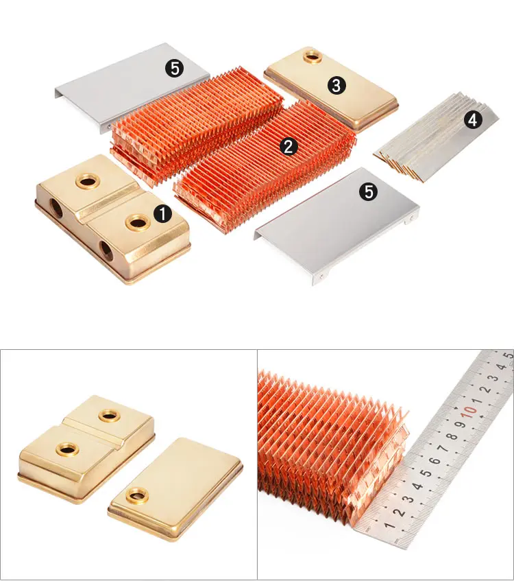 Material: Cámara de agua + Tubo plano (latón); aleta (cobre); Placa protectora (hierro inoxidable SUS430)