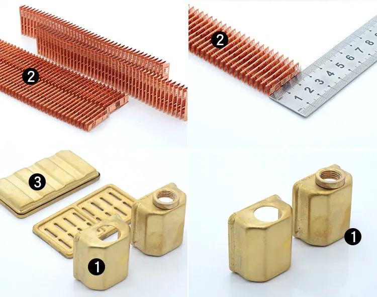 Material: Cámara de agua: latón; Tubo plano: latón; aletas: cobre; protectores laterales: acero (no en contacto con el agua)