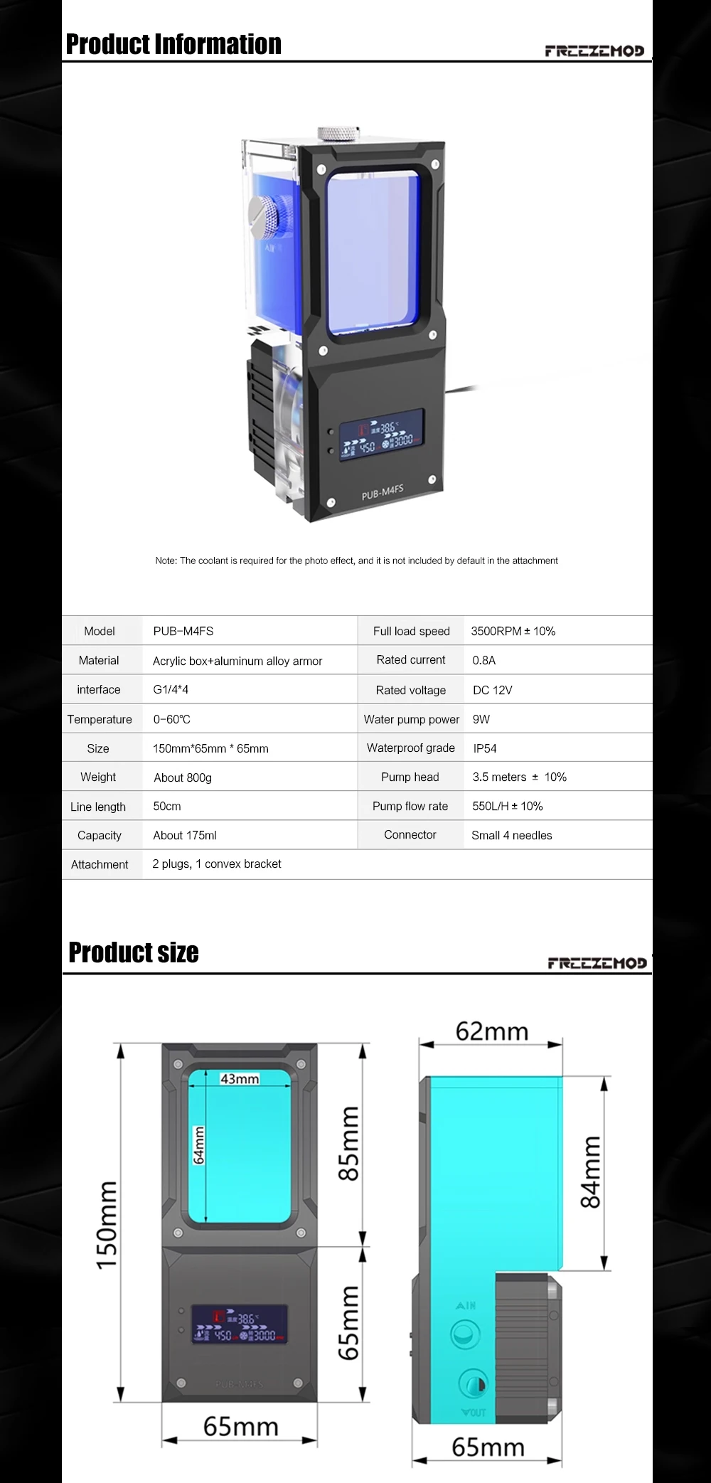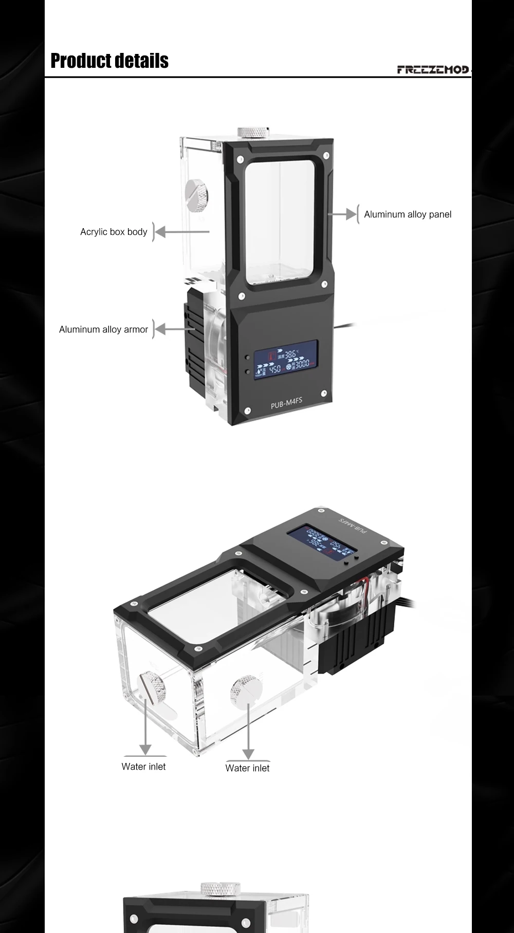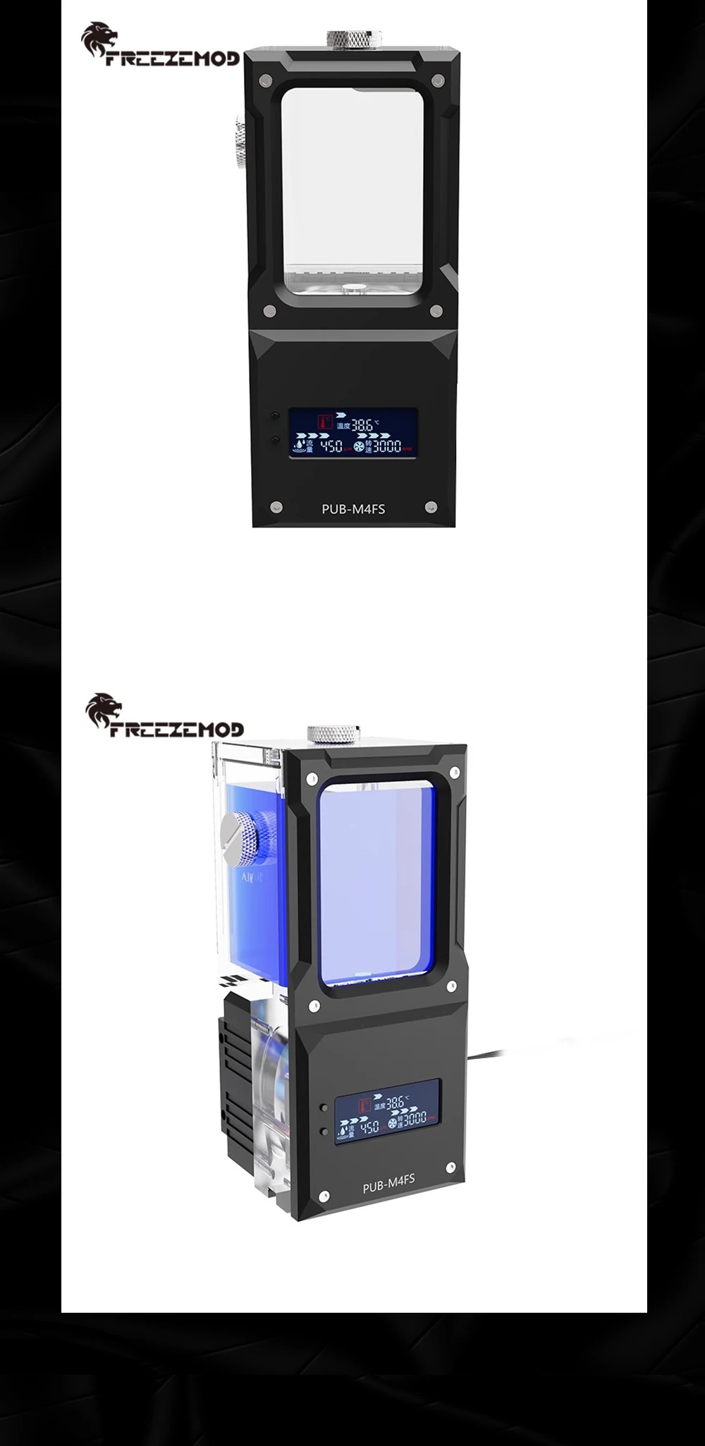 FREEZEMOD Mini bomba de agua cuadrada AIO + depósito, alarma de alta temperatura de apagado, panel metálico silencioso, PUB-M4FS
