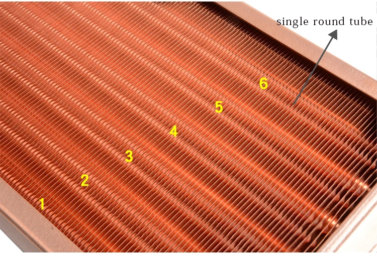 Especificación del canal: 7 mm * 0,28 mm * 6 piezas (el diámetro interior del tubo de cobre es de más de 6 mm, aumenta el paso del flujo de agua y las impurezas en el líquido) Densidad de las aletas: una pulgada=18,5 tiras Grosor de la aleta 0,11 mm