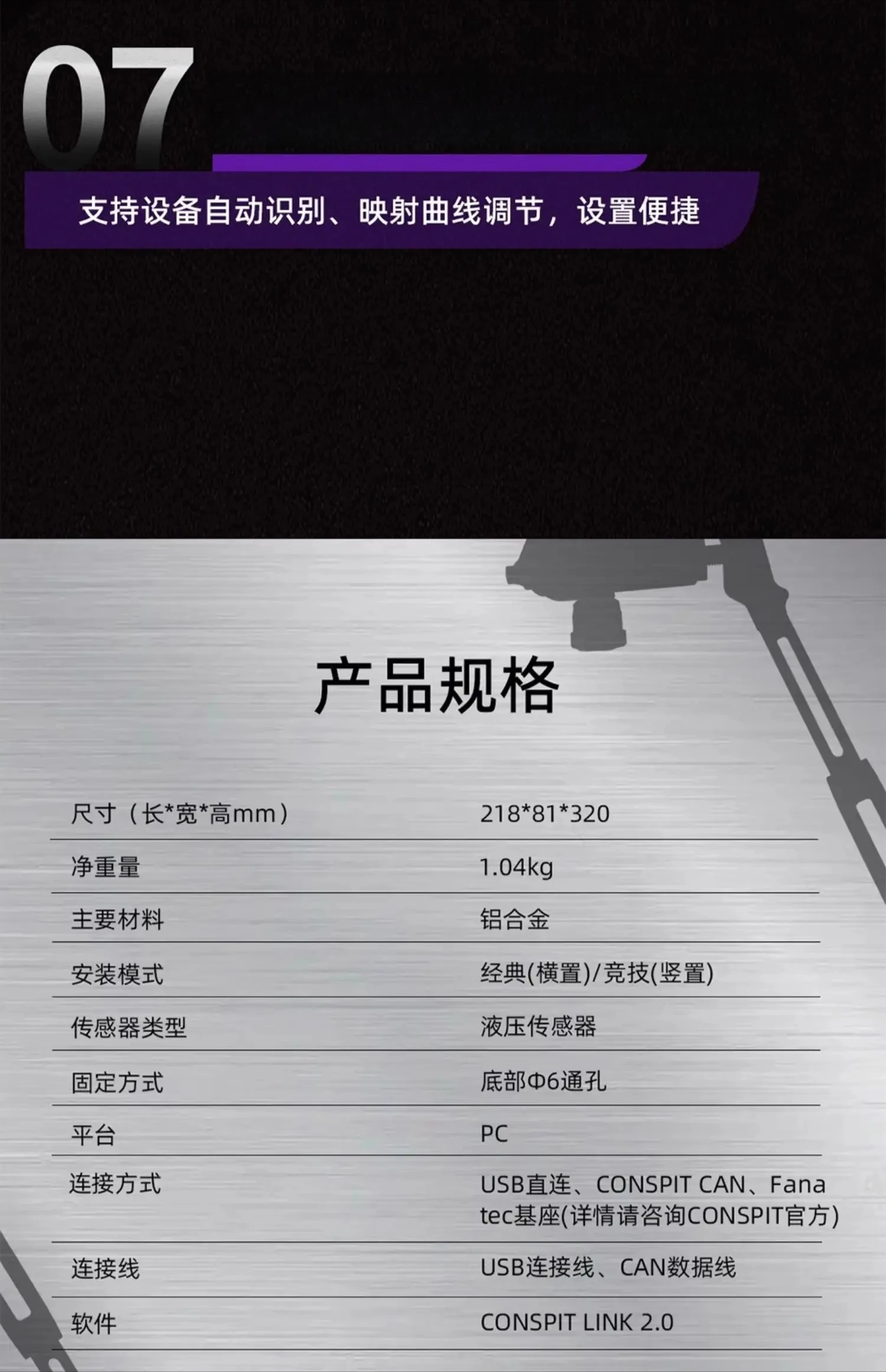 - Conexión: conexión directa USB, CONSPIT CAN y bases de ruedas Fanatec (contáctenos para más detalles)