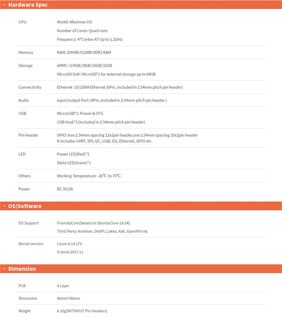 El NEO Core utiliza un popular SoC Allwinner H3 y tiene RAM DDR3 integrada de 256 M/512 M.FriendlyElec ofrece modelos con tres opciones de eMMC: 8GB/16GB/32GB y uno que no tiene eMMC en absoluto.
