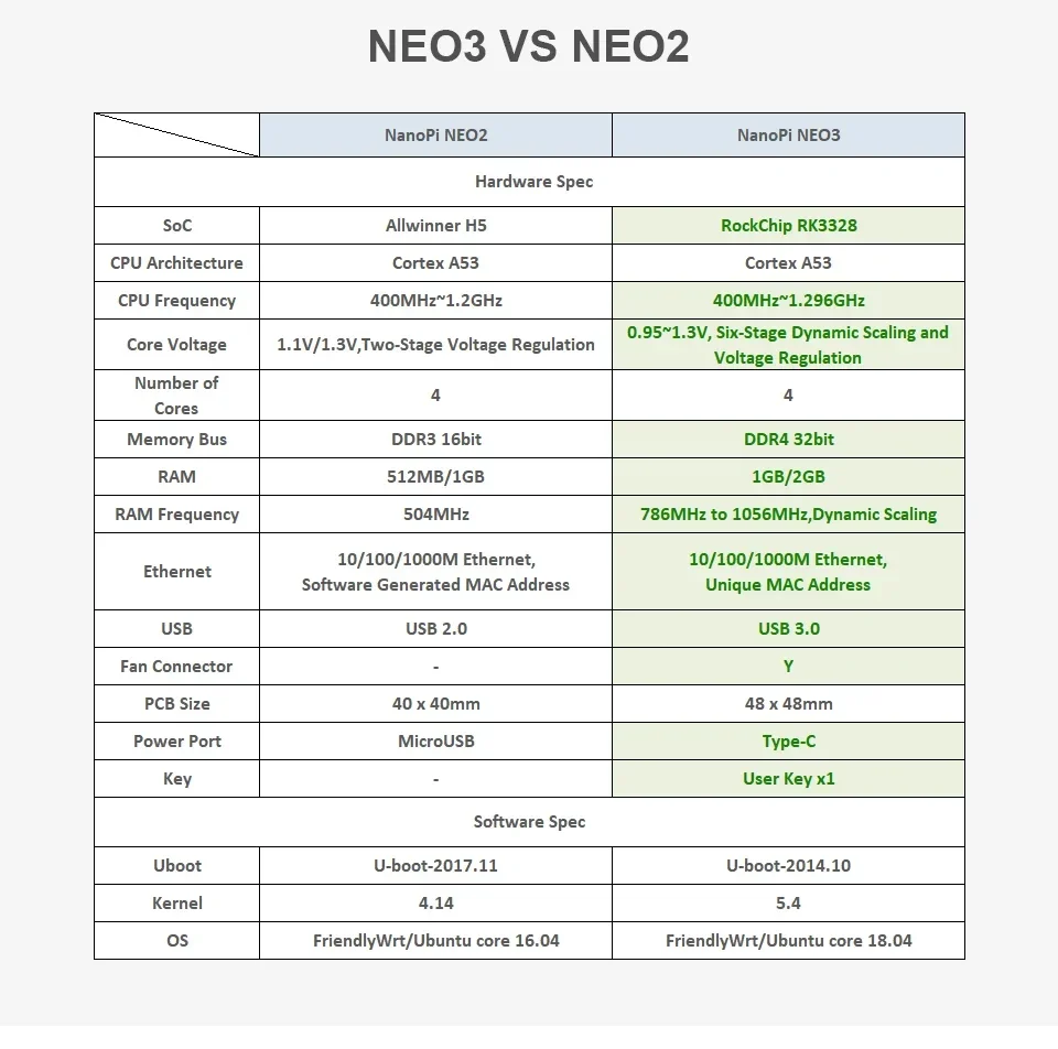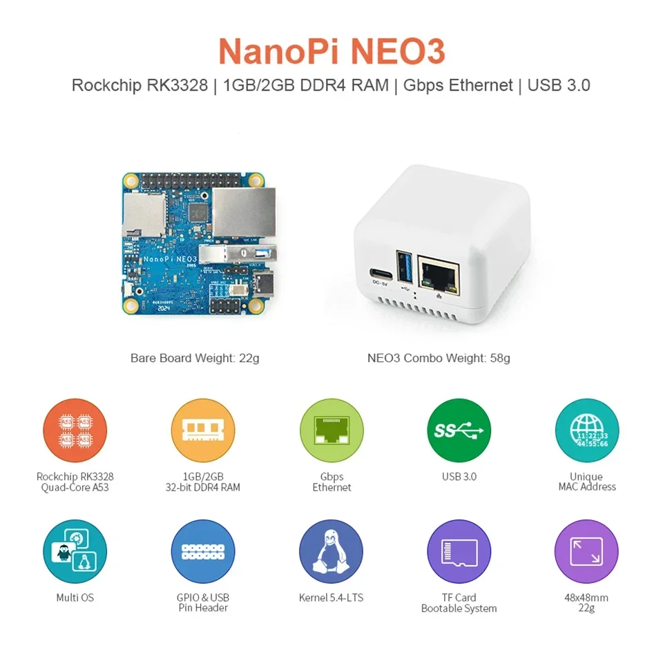 FriendlyElec NanoPi NEO3 1GB/2GB DDR4 RK3328 Cortex A53 64-bi Compatible con Ubuntu NEO2