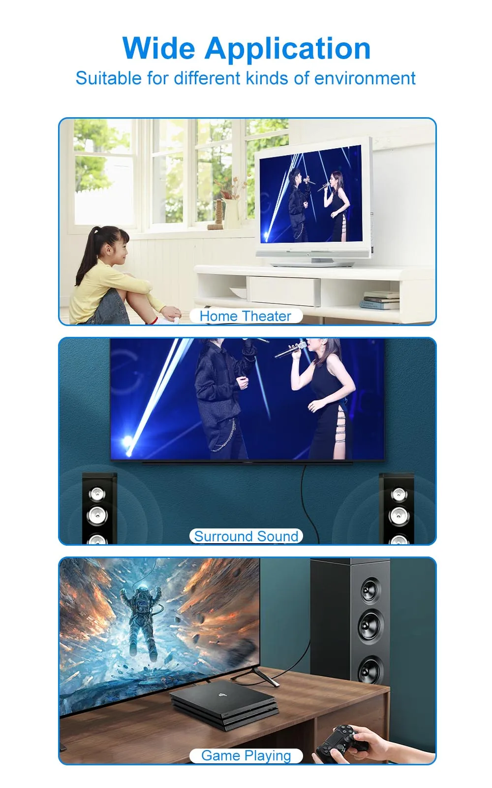 Descripción:Nombre: Cable de audio óptico digital metálicoLongitud: 1/1, 5/2/3/5/10 (M)Material del alambre: diámetro exterior OD2.2mmMaterial del núcleo: fibra ópticaMaterial del alambre: aleación de aluminioTecnología de interfaz: chapado en oroCaracterísticas:1. Tecnología de lente de fibra de concentración de alta precisión, que hace que elHaz altamente enfocado, reduce en gran medida el reflejo del haz en el interiorPared, asegura completamente la transmisión sin pérdidas de la señal óptica,Hace que la calidad del sonido sea clara y transparente, restaura la calidad del sonido,Y mantiene la integridad de la señal.2. El enchufe emergente es muy conveniente para una alineación precisa de las señales ópticas.Y transmisión exitosa de gran volumen de datos3. Enchufe súper resistente, cerca de la interfaz de fibra, y también muy fácil deEnchufar y desenchufar4. Rendimiento de transmisión de banda ancha con alta velocidad, alta fidelidad yBaja pérdida5. Larga vida útil, muy adecuada para decoración de líneas oscuras6. El cuerpo es suave y flexible.Uso del producto:El cable de fibra óptica de audio es un cable imprescindible para multicanal (5,1, 6,1 y7,1) Decodificación Dolby/DTS para varias transmisiones de señal de corto alcance,Comunicación y equipo de audio con terminales digitales de fibra ópticaConexiones como amplificadores, reproductores de DVD, VCR, reproductores de CD, MD, AMP,REPRODUCTOR, minidisco, conversor de digital a analógico y receptor de satélite yDispositivos optoelectrónicos, interruptores, tarjetas 1394, tarjetas de sonido de fibra óptica, cableDecodificadores, cámaras digitales, copiadoras, impresoras, equipos de impresión, LuzSensores y equipos industriales, automoción, equipos médicos ySistemas eléctricosInstrucciones:1. Retire las tapas antipolvo en ambos extremos del enchufe del cable de fibra óptica y conecte los conectores de fibra óptica (OPT OUT, OPT IN) de cada dispositivo.2. No doble el cable de fibra óptica en un ángulo inferior a 50 grados para evitar dañar el núcleo de la fibra.3. Antes de usar, retire la tapa antipolvo del enchufe de fibra y Manténgalo limpio.4. El enchufe de fibra tiene direccionalidad. Al usarlo, asegúrese de que el enchufe y el enchufe estén en la misma dirección antes de insertarlo en el enchufe.Lista:Cable de audio óptico digital * 1