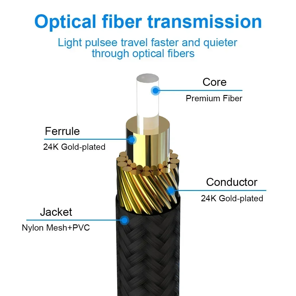 Descripción:Nombre: Cable de audio óptico digital metálicoLongitud: 1/1, 5/2/3/5/10 (M)Material del alambre: diámetro exterior OD2.2mmMaterial del núcleo: fibra ópticaMaterial del alambre: aleación de aluminioTecnología de interfaz: chapado en oroCaracterísticas:1. Tecnología de lente de fibra de concentración de alta precisión, que hace que elHaz altamente enfocado, reduce en gran medida el reflejo del haz en el interiorPared, asegura completamente la transmisión sin pérdidas de la señal óptica,Hace que la calidad del sonido sea clara y transparente, restaura la calidad del sonido,Y mantiene la integridad de la señal.2. El enchufe emergente es muy conveniente para una alineación precisa de las señales ópticas.Y transmisión exitosa de gran volumen de datos3. Enchufe súper resistente, cerca de la interfaz de fibra, y también muy fácil deEnchufar y desenchufar4. Rendimiento de transmisión de banda ancha con alta velocidad, alta fidelidad yBaja pérdida5. Larga vida útil, muy adecuada para decoración de líneas oscuras6. El cuerpo es suave y flexible.Uso del producto:El cable de fibra óptica de audio es un cable imprescindible para multicanal (5,1, 6,1 y7,1) Decodificación Dolby/DTS para varias transmisiones de señal de corto alcance,Comunicación y equipo de audio con terminales digitales de fibra ópticaConexiones como amplificadores, reproductores de DVD, VCR, reproductores de CD, MD, AMP,REPRODUCTOR, minidisco, conversor de digital a analógico y receptor de satélite yDispositivos optoelectrónicos, interruptores, tarjetas 1394, tarjetas de sonido de fibra óptica, cableDecodificadores, cámaras digitales, copiadoras, impresoras, equipos de impresión, LuzSensores y equipos industriales, automoción, equipos médicos ySistemas eléctricosInstrucciones:1. Retire las tapas antipolvo en ambos extremos del enchufe del cable de fibra óptica y conecte los conectores de fibra óptica (OPT OUT, OPT IN) de cada dispositivo.2. No doble el cable de fibra óptica en un ángulo inferior a 50 grados para evitar dañar el núcleo de la fibra.3. Antes de usar, retire la tapa antipolvo del enchufe de fibra y Manténgalo limpio.4. El enchufe de fibra tiene direccionalidad. Al usarlo, asegúrese de que el enchufe y el enchufe estén en la misma dirección antes de insertarlo en el enchufe.Lista:Cable de audio óptico digital * 1