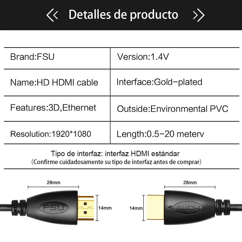 Comprar FSU Cable compatible con HDMI Cables de vídeo chapado en oro 1,4 4K 1080P Cable 3D para conmutador divisor HDTV 0,5 m 1m 1,5m 2m 3m 5m 10m