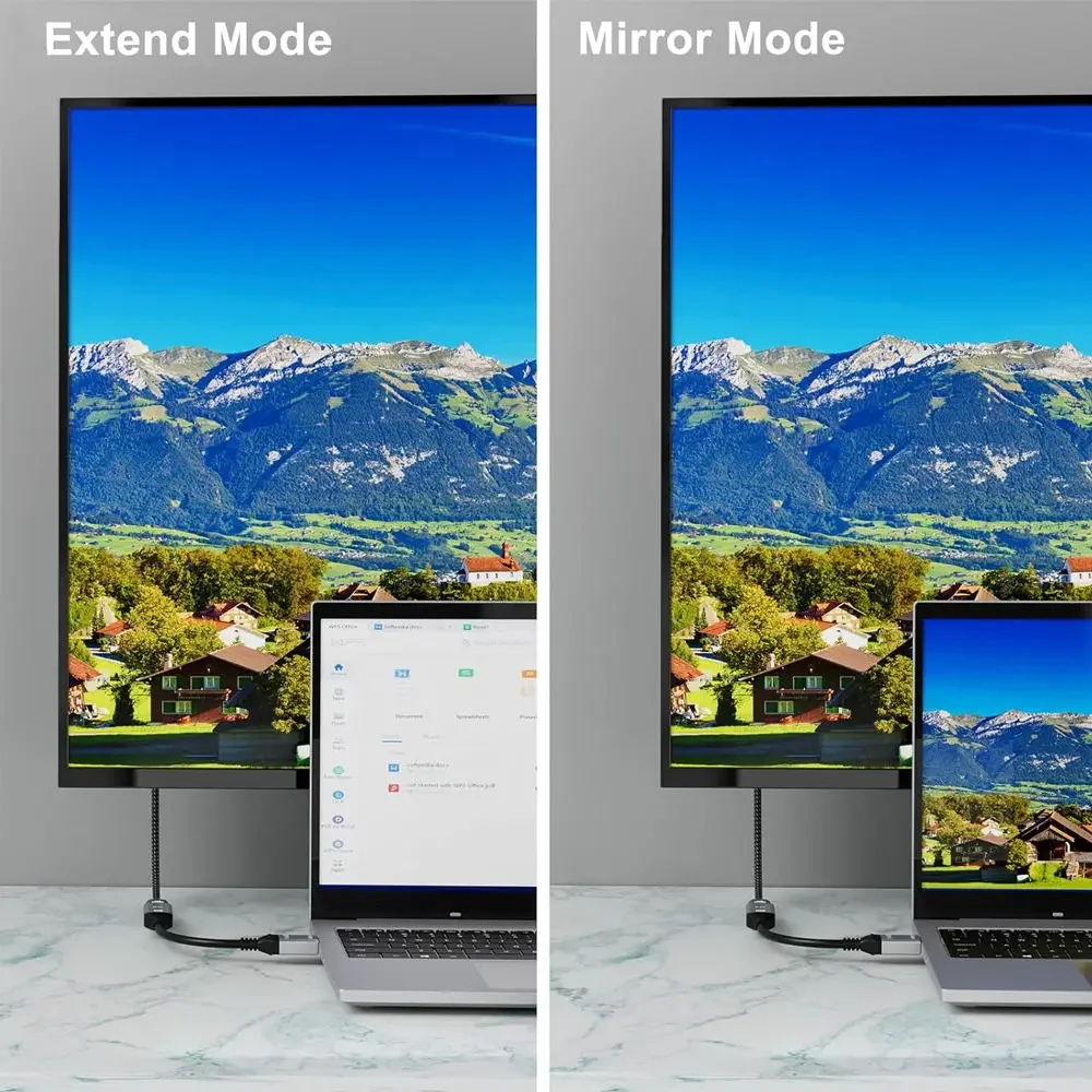 Usando este DP paraCompatible con HDMIAdaptador 8K, puede tener dos modos de visualización, lo que hace que su trabajo, su vida y estudio sean más convenientes.En el modo de copia, su pantalla principal y su pantalla externa muestran el mismo contenido, que se utiliza principalmente para el trabajo o la enseñanza; En modo extendido, su pantalla principal y su pantalla externa muestran diferentes contenidos, que se utilizan principalmente para el entretenimiento.