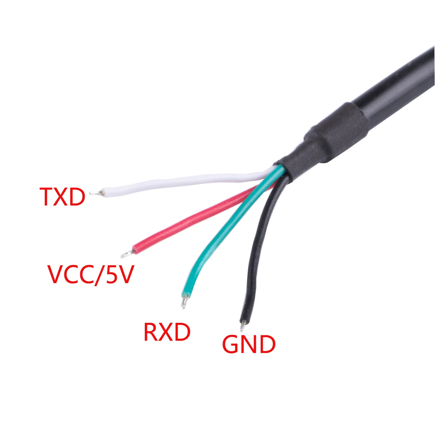 Extremo del cable de 4 pines:Blanco-TXD, verde-RXD, negro-GND, rojo-VCC/5V 28AWG PVC, cables de cobre desnudo (lado del extremo del cable, puede engarzar el conector RJ según sus necesidades)