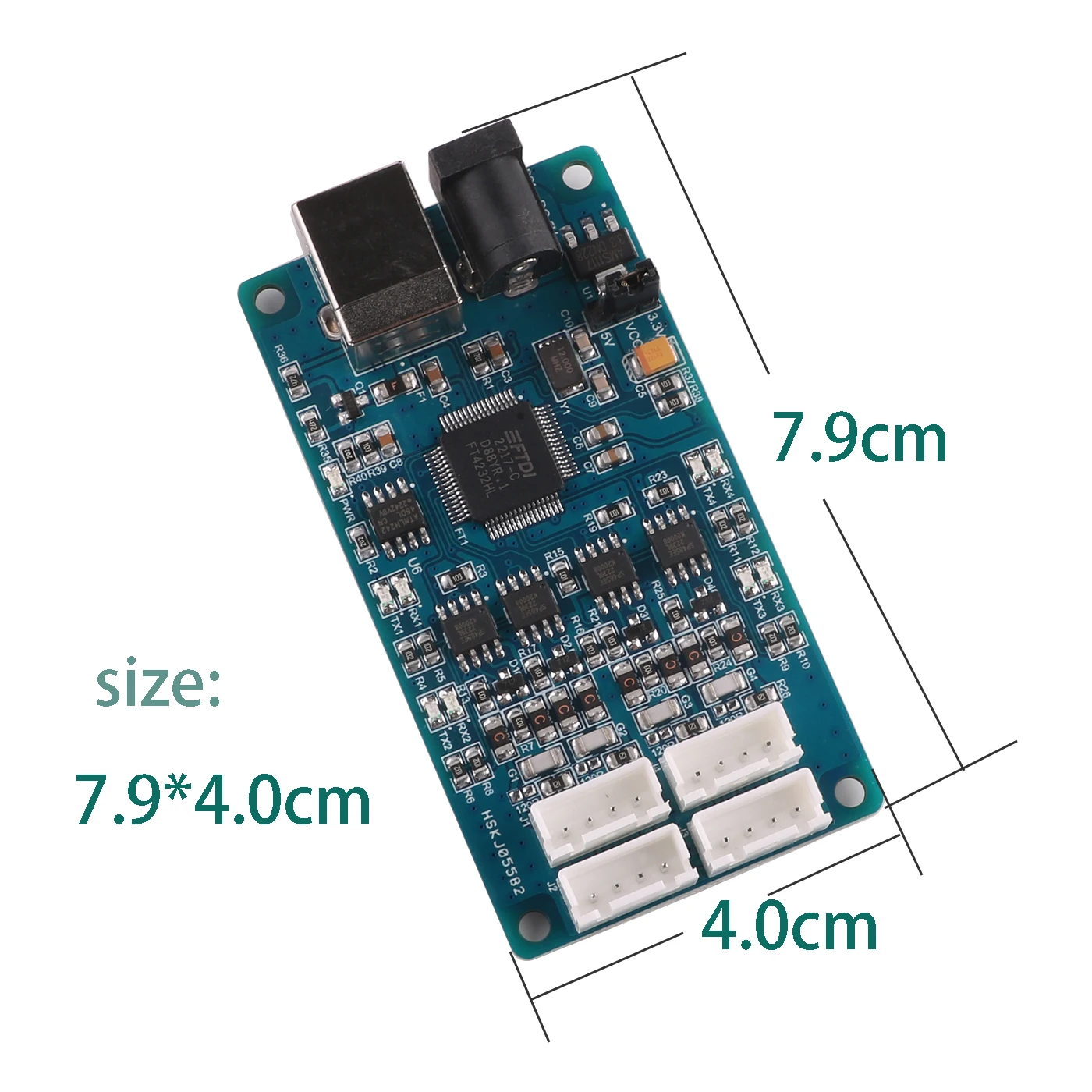 USB a puerto serie de 4 vías, con una velocidad máxima de 10Mbps, transmisión y conmutación automática, equipado con protección electrostática, protección contra sobrecorriente y protección contra rayos. Proporciona salida VCC conmutable de 5V/3,3 V. Volumen 4*7,9 cm.