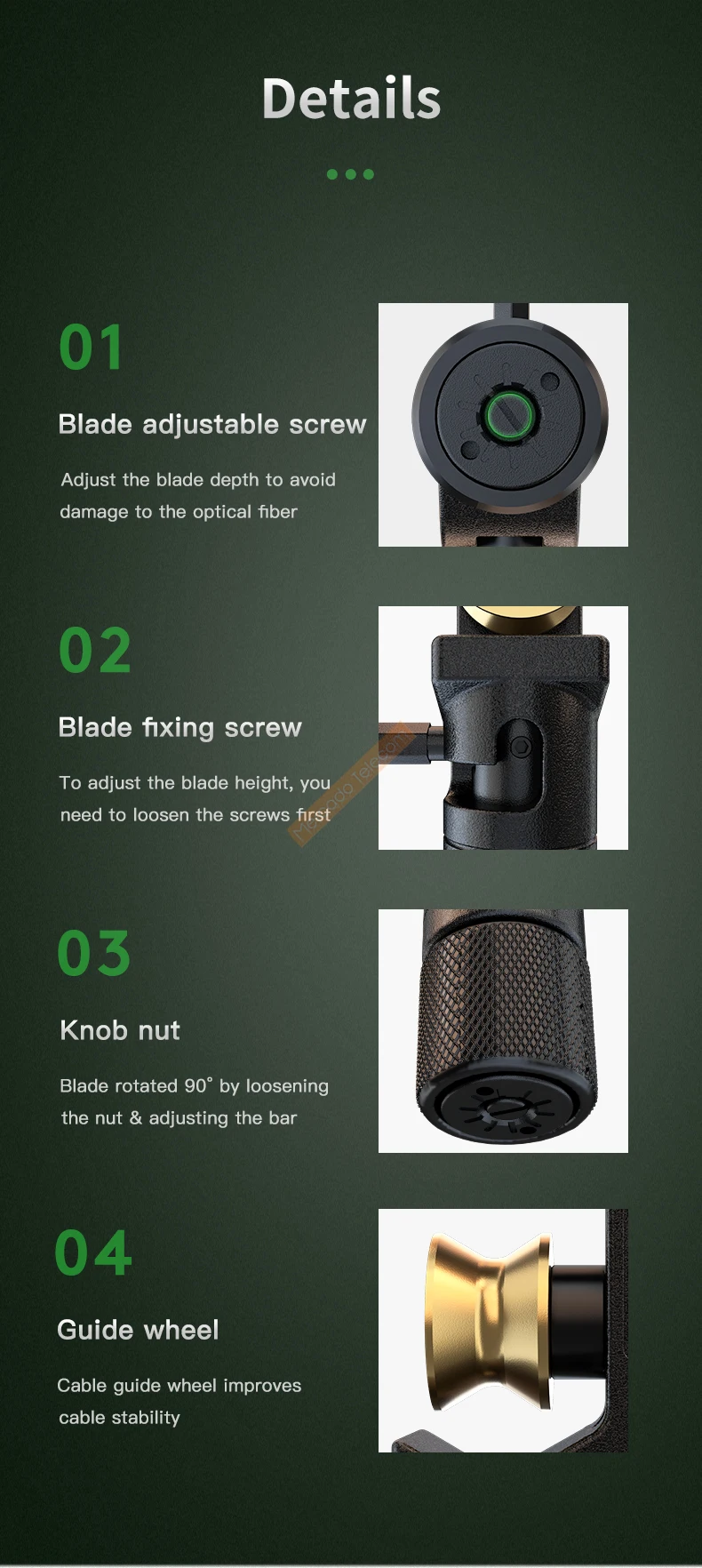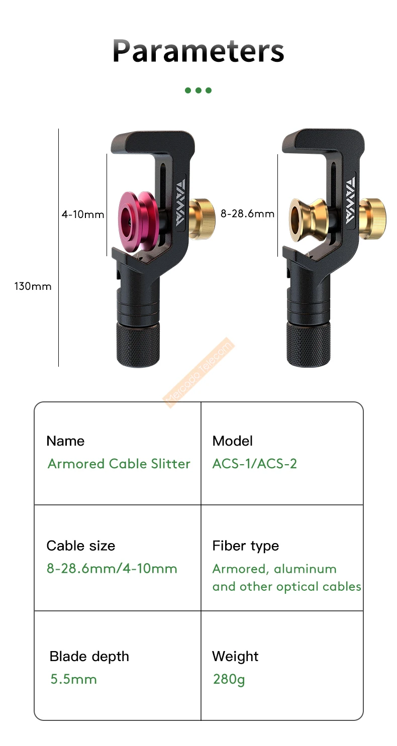 Los cortadores de cables blindados de la serie ACS son adecuados para cables ópticos de varios núcleos con fundas o fundas blindadas. La funda blindada de la capa exterior del cable óptico se quita rápidamente para obtener la fibra óptica en el interior. Puede cortar longitudinal y circularmente, y la altura de la cuchilla también se puede ajustar según los requisitos. El diseño de la rueda guía hace que el pelado sea rápido. Puede cortar la cubierta exterior de polietileno y la armadura paso a paso con precisión para evitar dañar la fibra óptica.