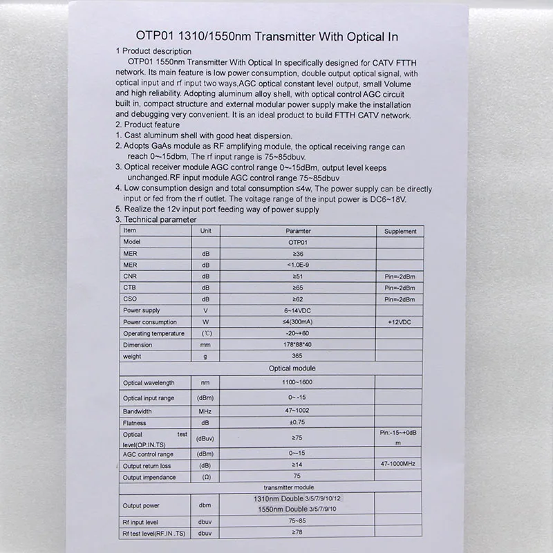 Transmisor OTP01 1550nm con entrada óptica diseñado específicamente para la red CATV FTTH. Su característica principal es el bajo consumo de energía, la señal óptica de salida doble, con entrada óptica y entrada RF de dos vías, Salida Óptica de nivel constante AGC, volumen pequeño y alta fiabilidad. La ADOPCIÓN DE carcasa de aleación de aluminio, con circuito AGC de control óptico integrado, estructura compacta y fuente de alimentación modular externa hacen que la instalación y depuración sea muy conveniente. Es un producto ideal para construir una red FTTH CATV.