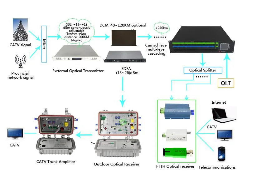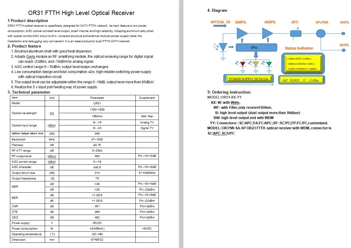 2. Control AGC óptico completamente automático, potencia óptica de entrada-0 ~ - 15dBm, nivel de salida sin cambios, CTB, CSO básicamente sin cambios.