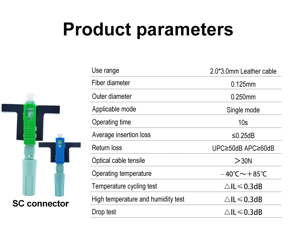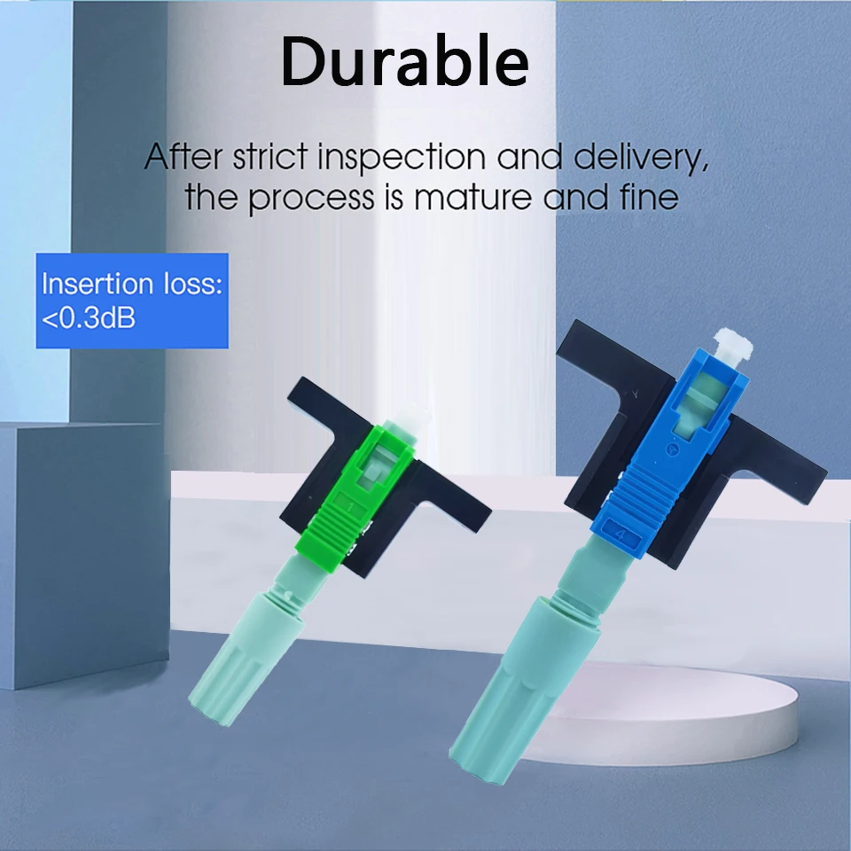 El conector rápido óptico de campo de conector SC reutilizable está diseñado para uso en campo en cables planos (baja fricción) de hasta 3mm y/o cables ópticos de 2 a 3mm en redes FTTH.