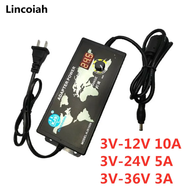 Specifications:Name: Adjustable Power AdapterColor: Mainly blackInput: AC100-240V 50/60HzOuput: DC 3-12V / 3-24V / 3-36V adjustableOutput current: 10A / 5A / 3APower: 120WTotal cable length: 200cmEfficiency: 95%Size: 120*50*30mmDC plug: 5.5MM * 2.5MM