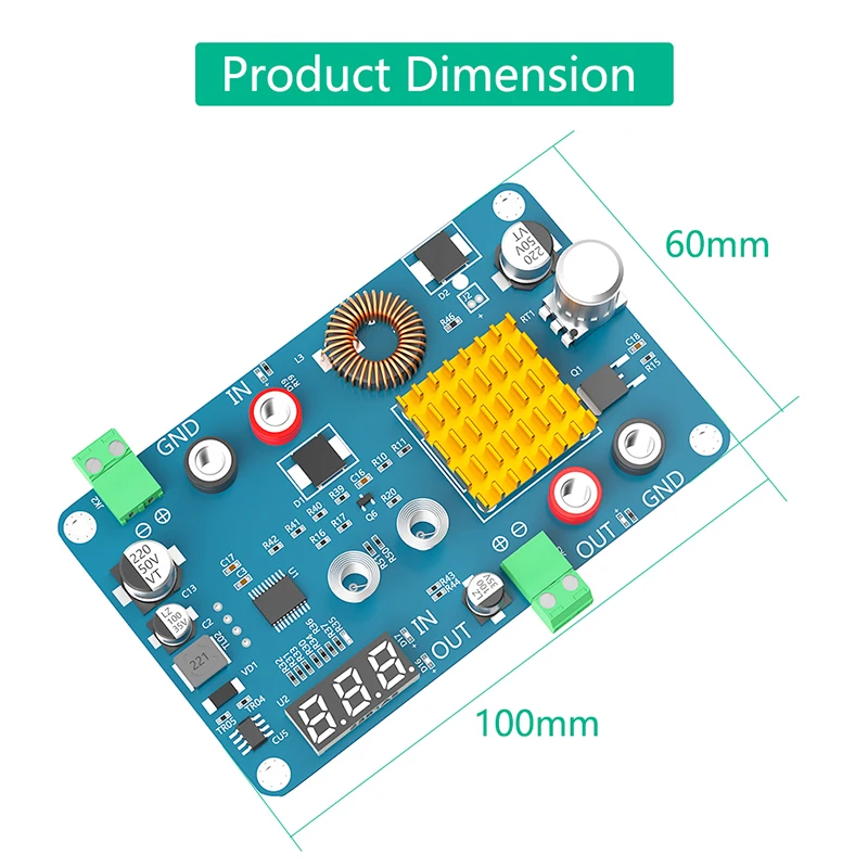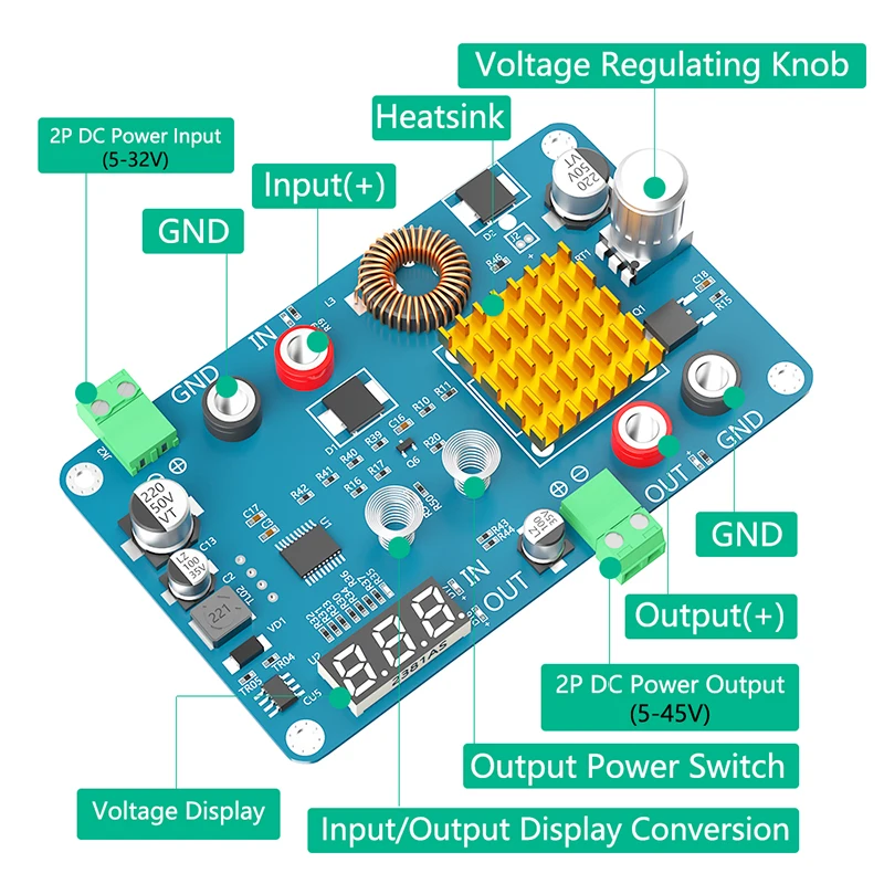 1. PARÁMETRO --- rango de voltaje de entrada DC 5V-32V; rango de voltaje de salida DC 5V-47V; corriente de salida máxima 3A.