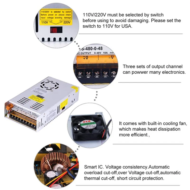 Características y ventajas:Bajo precio y alta fiabilidadCondensador de salida de 105 grados CelsiusEntrada AC universalAlta eficiencia y baja temperatura de funcionamientoLa corriente de arranque suave puede reducir el impacto de la entrada de CA de manera efectivaCon protección contra cortocircuitos y sobrecargasTamaño compacto, peso ligero100% prueba de quemado a carga completaInstalar con filtro EMI, onda mínimaNombre del producto: fuente de alimentación conmutada ajustable de 500W con pantalla digitalVoltaje de entrada: + 15%Voltaje de salida: 1, 2 20A/2, 1, 1 13A/2, 2, 1, 2, 2, 1, 2, 2, 2, 1, 2, 1, 2, 2, 2, 1, 2, 2, 2Potencia nominal: 500WTamaño del producto: 215mm (largo) * 115mm (ancho) * 50mm (alto),La función de protección de cortocircuito/sobrecarga/sobretensión100% prueba de quemado a carga completaVoltaje de entrada y rango de frecuencia ----------- 110/220VAC/47 ~ 63HzCorriente de impacto de arranque --------------- 20A a 120V CA (arranque en frío)Rango de salida de-+ 10% (voltaje de salida nominal)Protección contra sobrecarga ------------------- 105% ~ 200% (carga nominal), recuperación automáticaProtección contra sobretensión ------------------- 115% ~ 135% (voltaje de salida nominal)Protección contra cortocircuitos ------------------- auto recuperaciónTiempo de inicio de salida-2S @ 120VAC 1,0 S @ 230VACTiempo de retención de salida-más de 10mS @ 120VAC, más de 20mS @ 230VACLa FUERZA DE AISLAMIENTO ------------------- entrada-salida: AC1500V, 1minCaja de entrada: AC1500V, 1minSalida-Caja: DC500V, 1minEl ambiente de trabajo de C - 10 a 50 grados C; 20% ~ 90% RH (sin condensación)Estándar DE SEGURIDAD DE REFERENCIA EN/UL60950Estándar EMC-Diseño de referencia EN55022 Clase B;:-3/-3/-4/-5/-6/-11