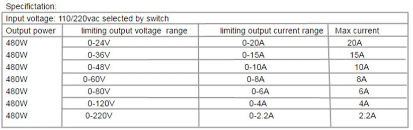 1. Rango de voltaje de salida: 0-5V (ajustable hasta 8V) corriente de salida continuamente ajustable: 0-60ARango de voltaje de salida: 0-12V (ajustable hasta 15V) corriente de salida continuamente ajustable: 0-40ARango de voltaje de salida: 0-24V (ajustable hasta 27V) corriente de salida continuamente ajustable: 0-20ARango de voltaje de salida: 0-36V (ajustable hasta 38V) Corriente de salida continuamente ajustable: 0-15ARango de voltaje de salida: 0-48V (ajustable hasta 50V) corriente de salida continuamente ajustable: 0-10ARango de voltaje de salida: 0-60V (ajustable hasta 62V) corriente de salida continuamente ajustable: 0-8ARango de voltaje de salida: 0-80V (ajustable hasta 82V) corriente de salida continuamente ajustable: 0-6ARango de voltaje de salida: 0-120V (ajustable hasta 122V) corriente de salida continuamente ajustable: 0-4ARango de voltaje de salida: 0-160V (ajustable hasta 162V) corriente de salida continuamente ajustable: 0-3ARango de voltaje de salida: 0-220V (ajustable hasta 222V) corriente de salida continuamente ajustable: 0-2.2ARango de voltaje de salida: 0-300V (ajustable hasta 305V) corriente de salida continuamente ajustable: 0-1.6A
