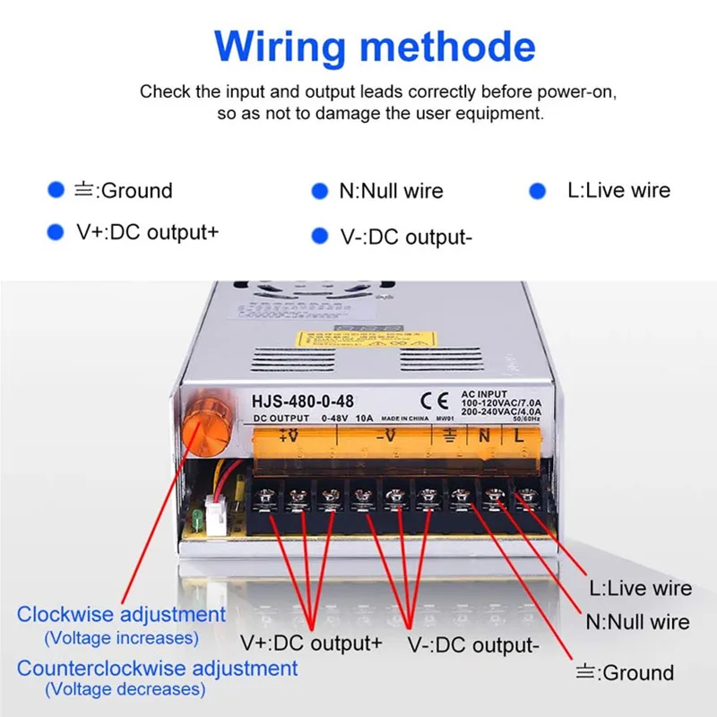 Lincoiah 5V 12V 24V 36V 48V Adjustable Switching Power Supply 60V 80V 120V 160V 220V 480W With Digital Display Power Supply 5V 12V 24VFirst, technical performance indicators1. Output voltage range: 0-- 5V continuously adjustable output current: 60AOutput voltage range: 0-12V continuously adjustable output current: 40AOutput voltage range: 0-24V continuously adjustable output current: 20AOutput voltage range: 0-36V continuously adjustable output current: 15AOutput voltage range: 0-48V continuously adjustable output current: 10AOutput voltage range: 0-60V continuously adjustable output current: 8AOutput voltage range: 0-80V continuously adjustable output current: 6AOutput voltage range: 0-120V continuously adjustable output current: 4AOutput voltage range: 0-220V continuously adjustable output current: 2.2A2, Ripple voltage; no more than 100mV3, The equivalent internal resistance of the regulator: not more than 0.O5Ω4, Voltage adjustment rate:5, with short circuit, overload protection, automatic recovery functionInput voltage: AC110V/220V±15%Rated power: 480WProduct size: 21.5CM (length) * 11.5CM (width) * 5CM (height),The Output current depends on the load ,can't more than the max output currentInstructions for use:Uses: Mainly used in various DC equipment, DC motor stepless speed regulation, LED stepless dimming, chemical electroplating speed regulation, scientific research test, student experiment, etc., and a wide range of uses.Special attention: If using inductive load such as motor or fan, please pay attention to the motor starting current parameter. This parameter must not be higher than the power supply current. Otherwise, the power supply may be damaged. You should select a higher current power supply or provide soft start protection for the motor. The circuit absorbs the inrush current.Power formula) voltage X current=powerTerminal description and wiring methodL, N AC input terminal FG ground mark V+ DC output positive terminalV-DC output negative terminal ADJ adjustable potentiometer Fine-tuning output DC voltage● Full voltage input● Miniaturization● Protection function Short circuit / overload / over voltage● 100% full load aging testInput Voltage & Frequency Range----------110V/220VAC/47~63HzStart surge current ---------------20A@120VAC (cold start)Output adjustment range --------------- ±100% (rated output voltage)Overload protection -------------------105%~200% (rated load), self-recoveryOvervoltage protection -------------------115%~135% (rated output voltage)Short circuit protection ------------------- self-recoveryOutput start time ---------------≤2S@120VAC ≤1.0S@230VACOutput hold time ---------------≥10mS@120VAC, ≥20mS@230VACInsulation strength ------------------- Input - Output: AC1500V, 1minInput - housing: AC1500V, 1minOutput - Case: DC500V, 1minWorking environment ------------------ -10 ° C ~ 50 ° C; 20% ~ 90% RH (no condensation)
