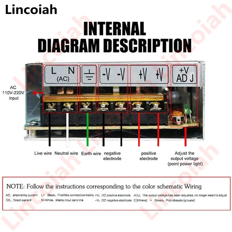 AC 100-240V DC 12V 60W 120W 150W 200W 250W 360W fuente de alimentación conmutada Cámara CCTV para tira de LED interruptor de luz cargador de controladorCaracterísticas:1. Condición: nuevo2.Material: Metal3. Certificación: CE y FCC4. Condiciones de trabajo: 0 ~ 45 ℃ 0 ~ 95% sin condensación5. Condición de almacenamiento:-20 ℃ ~ 80 ℃ 10% ~ 95% RH6. Protección: protección contra escasez, protección contra sobrecarga, protección contra sobretensión7. Entrada: CA 100-110V/220-240V(Voltaje de entrada dual: CA 100-110V/220-240V hay un interruptor selector de voltaje ubicado en el lado del conmutador, se utiliza para configurar el voltaje de entrada a la fuente de alimentación a 100-110V o 220-240V. Nos ajustamos a la velocidad de 100 V por defecto. Si quieres usar CA 110-110V, no olvides ajustar el interruptor al lado de V antes de usarlo.8. Voltaje de salida: salida de 12V CC9. Diseño PWM de protección contra sobretensión, sobrecorriente y cortocircuito incorporado, asegura la estabilidad y la alta eficiencia de la fuente de alimentación. Anti-jamming, pasó la prueba EMC, onda menos de 20MV. Salida de voltaje constante, asume una fuente de alimentación estable para que las luces LED alcancen una larga vida útil10. Controlador de transformador de fuente de alimentación LED ampliamente utilizado en iluminación LED, electrodomésticos, instrumentación, automatización de oficina, telecomunicaciones, industrias de procesos e ingeniería, etc.Nota: SOLO PARA USO EN PUERTAConexión:L, N: Entrada de alimentación de CA: GND-V: salida de potencia de CC "-"+ V: salida de potencia CC "+"+ V ADJ: Ajuste el voltaje de salida (15%)Aviso:El paquete incluye: 1 transformador de alimentación.Esta fuente de alimentación no viene con instrucciones de instalación, cable de cableado, interruptor de encendido/apagado o tornillos;Se recomienda encarecidamente la instalación profesional de un electricista calificado. Por favor, no deje que el producto trabaje largas horas sobre la corriente de la tasaAsegúrese de que la potencia sea inferior o igual a la fuente de alimentación nominalGracias por comprar en la tienda Lincoiah, ¡le deseo una feliz compra!