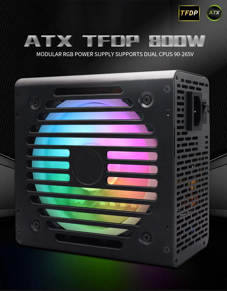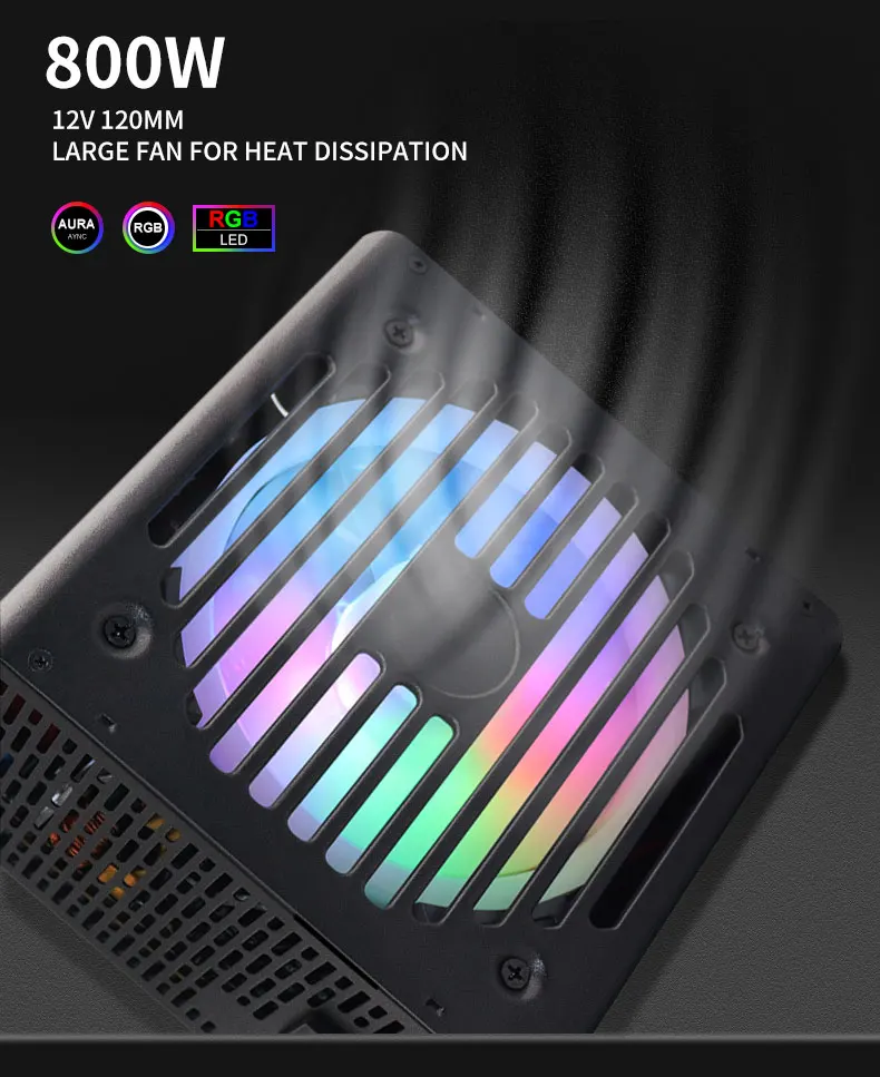Fuente de alimentación RGB 800W ATX. Ofrece una velocidad de salida continua de 800 vatios. La potencia máxima puede alcanzar 1000W. Proporciona hasta un 95% o más de eficiencia operativa.