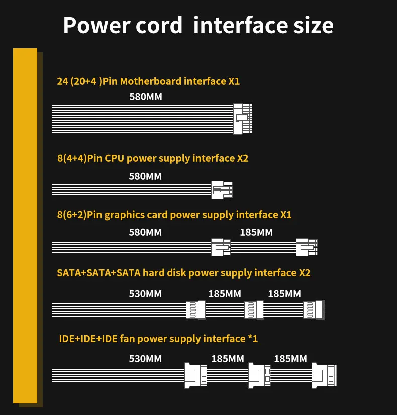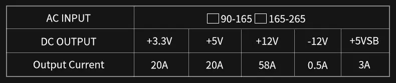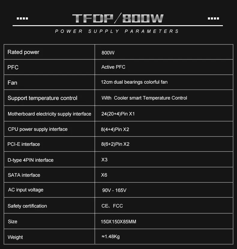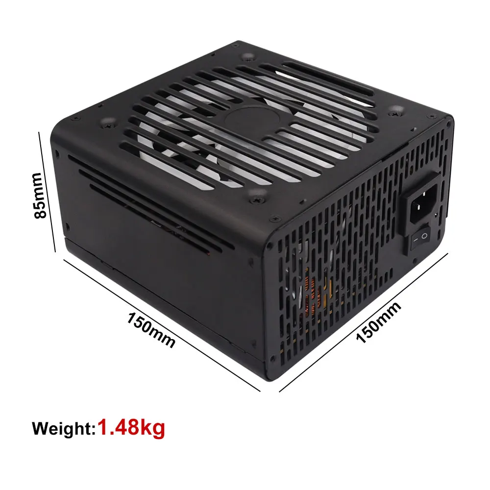 Tamaño: 150x150x85mm. Factor de forma ATX estándar. Interfaz de placa base de 20 + 4 pines, interfaz de CPU de 4 + 4 pines, PCIe de 6 + 2 pines. Admite CPU dual.