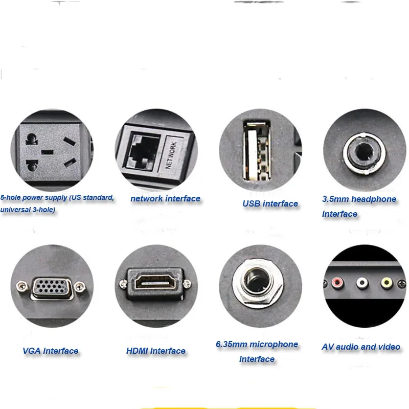 Interfaz de micrófono 6,35, audio y video AV, interfaz HD, interfaz VGA,