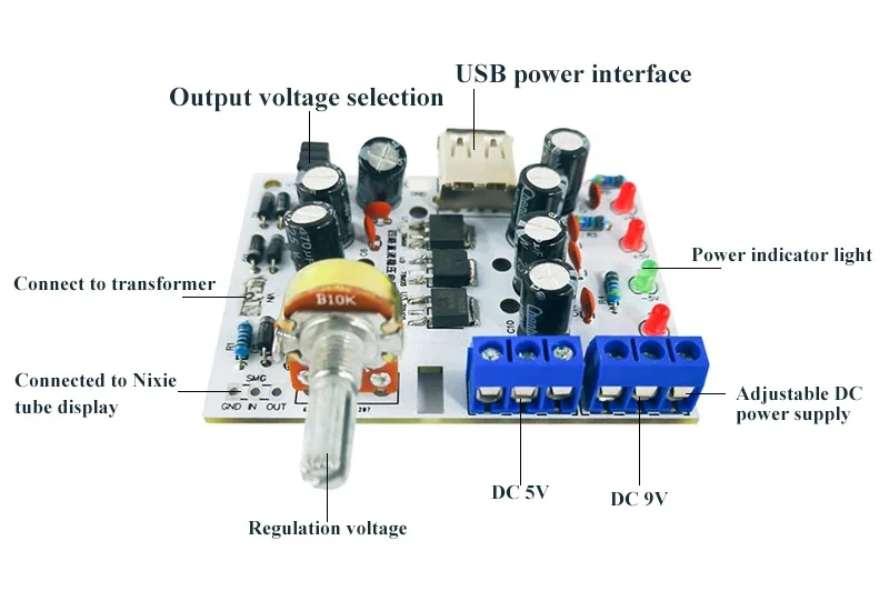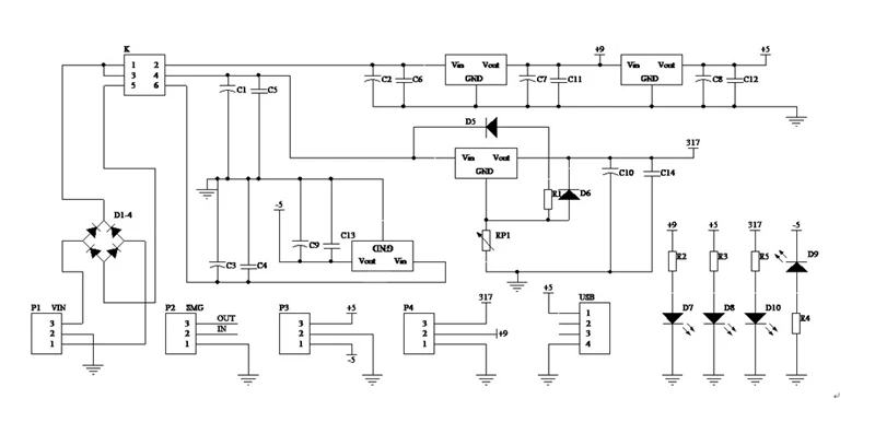 Este circuito se compone principalmente de un circuito integrado LM317 y un kit de fuente de alimentación estabilizada SMD de tres terminales que consta de 78M05, 78M09 y 79M05.LM317 es uno de los circuitos ampliamente utilizados, que no solo tiene una forma simple de regulación de voltaje fija de tres terminales, sino que también tiene la característica de un voltaje de salida ajustable.Además, también tiene las ventajas de un amplio rango de regulación de voltaje, buen rendimiento de estabilización de voltaje, bajo nivel de ruido y alta relación de supresión de ondulación.El kit está equipado con una interfaz USB, que puede emitir 5 V CC y está conectado externamente con un tubo Nixie para mostrar el voltaje.