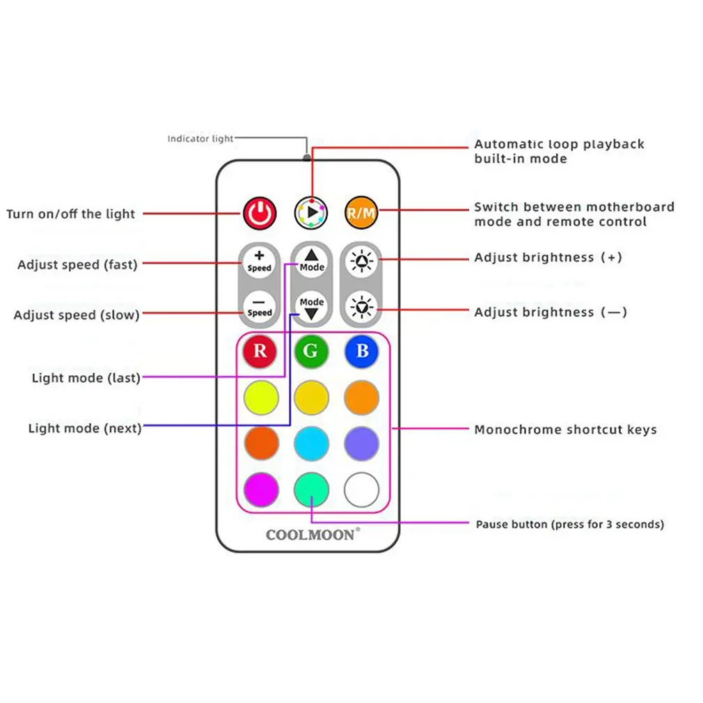 2. Efectos de iluminación: Hay más de 360 tipos de efectos de iluminación en el patrón de control remoto. Incluso si la placa base no admite sincronización de 5V, hay muchas formas de jugar con el control remoto.