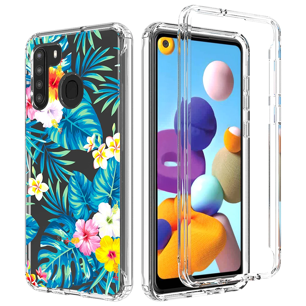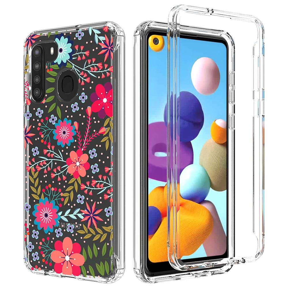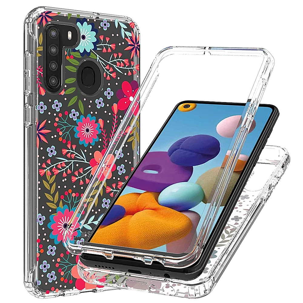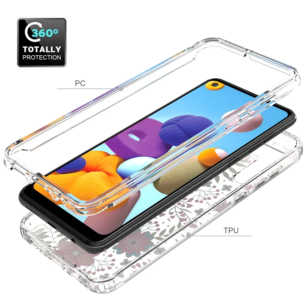Funda de flores pintadas transparentes 2 en 1 para Samsung Galaxy A21, PC de cristal duro + TPU suave 360, funda protectora completa para teléfono