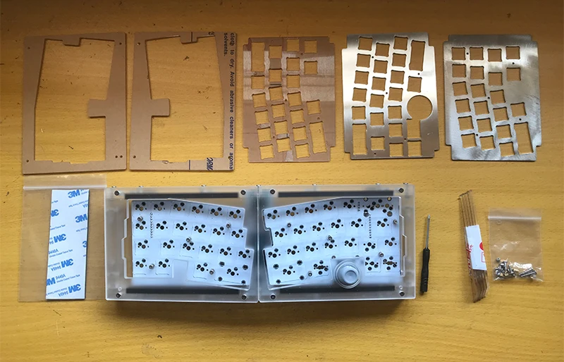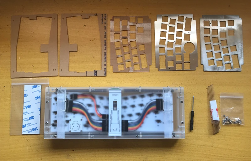 El kit incluye: carcasa apilada acrílica, placa de metal, PCB dividido, arreglo de cables, varios tornillos, almohadilla de pie de silicona.
