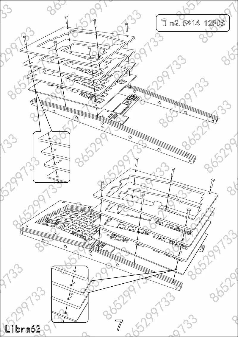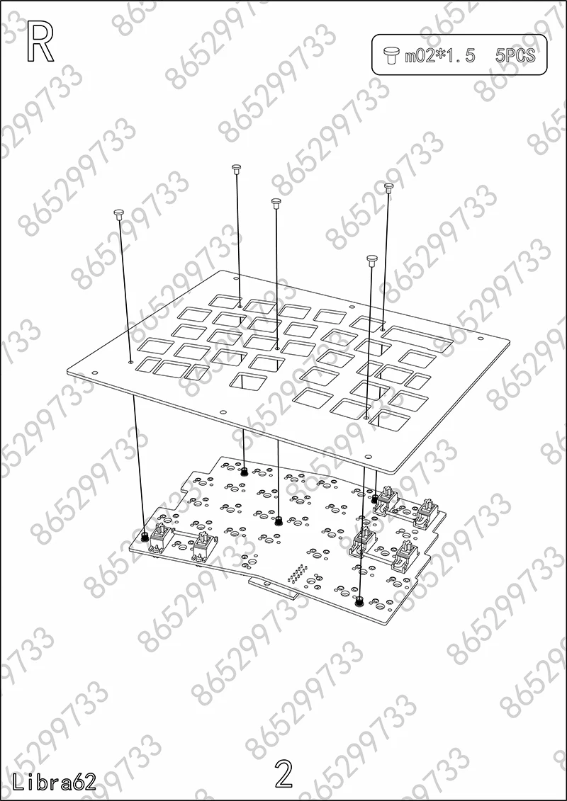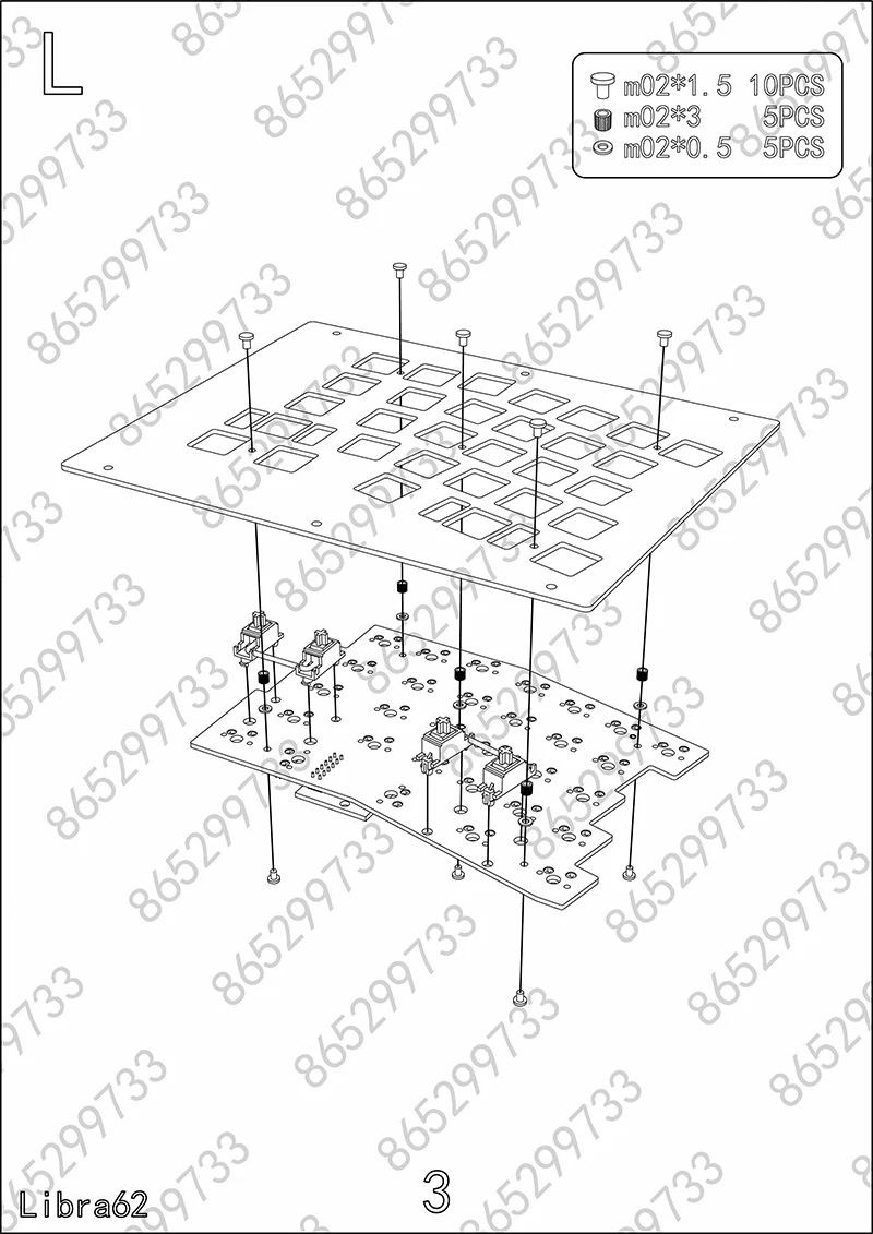 Libra mini: Carcasa apilada de acrílico, placa de metal, PCB dividido, arreglo de cables, varios tornillos, almohadilla de pie de silicona