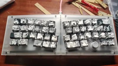 Kit 2Carcasa acrílica apilada, placa metálica, PCB dividido, disposición de cables, varios tornillos, almohadilla de pie de silicona, interruptor Gateron 40 piezas (amarillo, azul, negro, blanco, rojo, marrón, verde). Observaciones del pedido + GMK Civilization Keycap ()