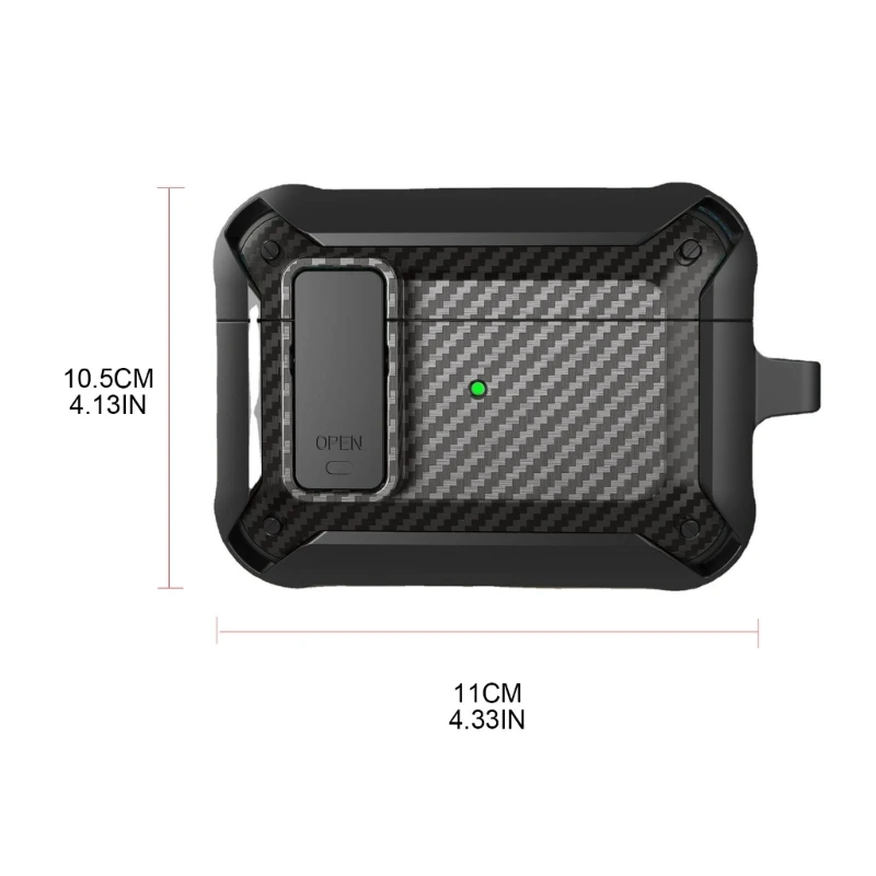 Material compacto de fibra de carbono con amortiguador de bordes mejorado, esta armadura fresca protegerá su airpod-pro 2 de caídas o arañazos. El diseño elegante transformará tus Airpods-Pro 2.