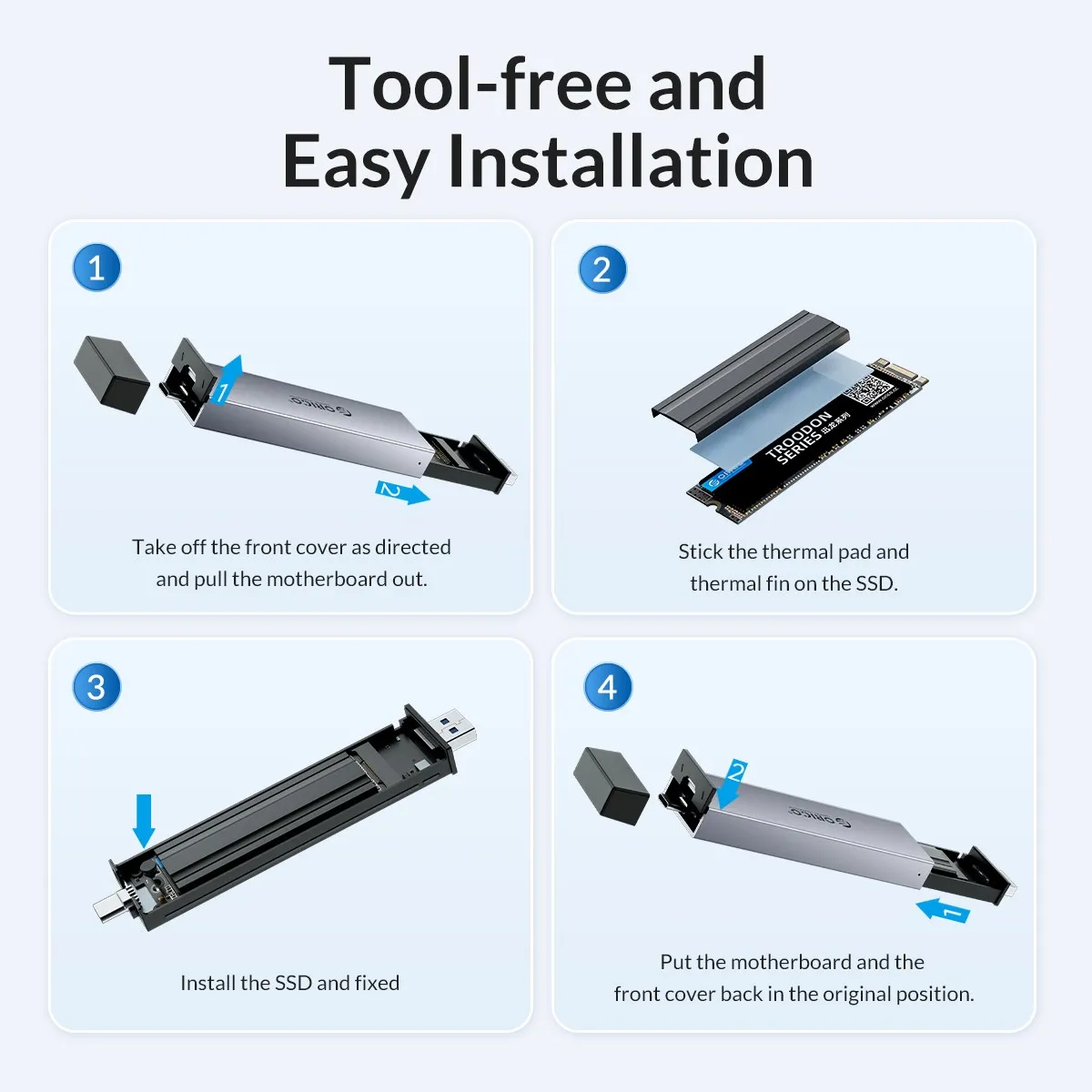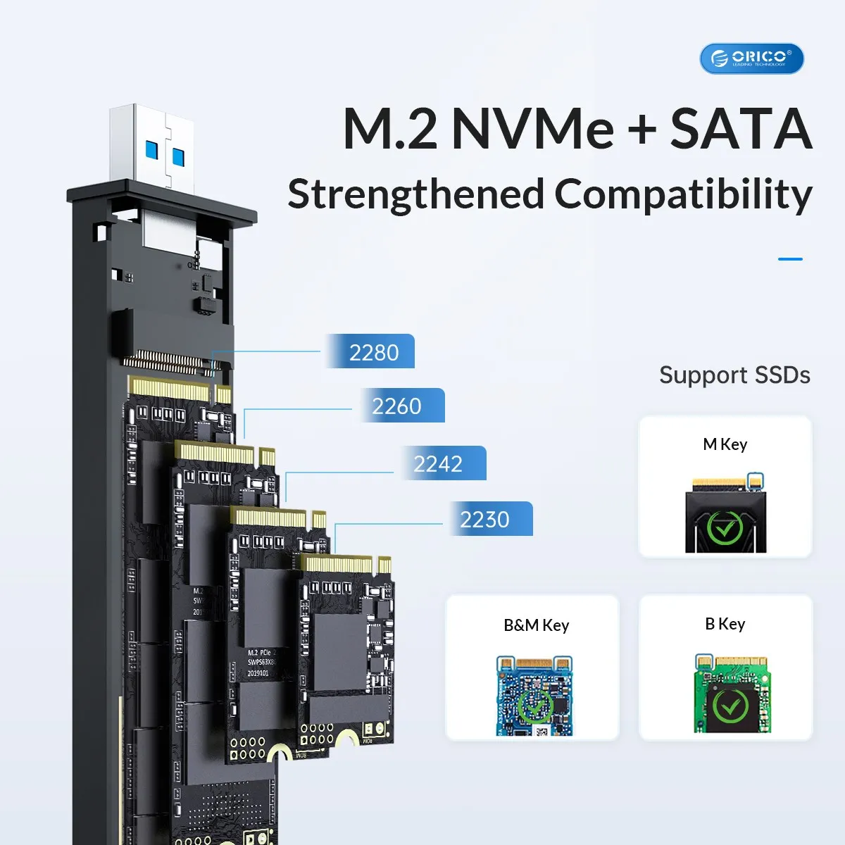 【Wide Compatibility】ORICO Dual Protocol M.2 enclosure compatible with both M.2 SATA and NVMe M Key / M&B Key in sizes 2230/2242/2260/2280. NOT Compatible with M.2 SATA B-Key SSDs, M.2 PCIe AHCI SSDs, M.2 PCIe devices. Support System Multi OS, Windows, Mac OS, Linux, Android.