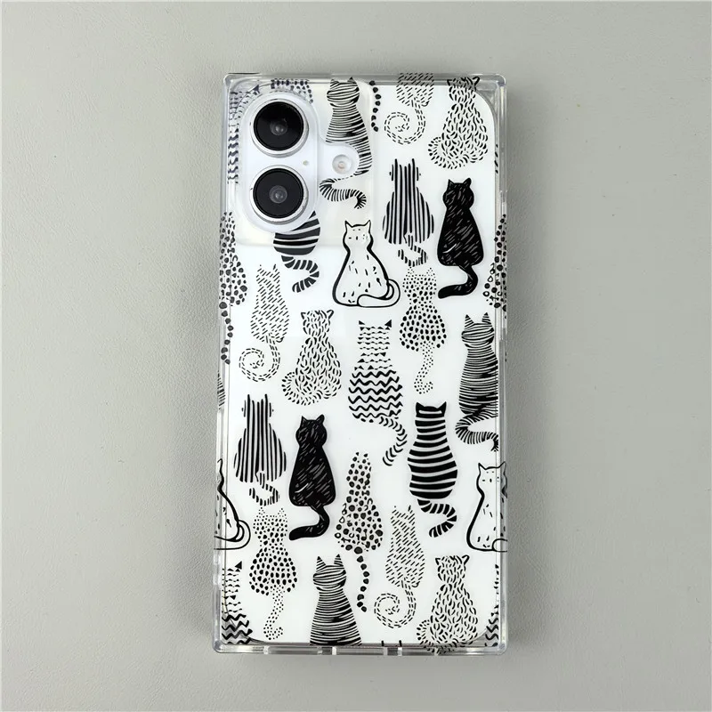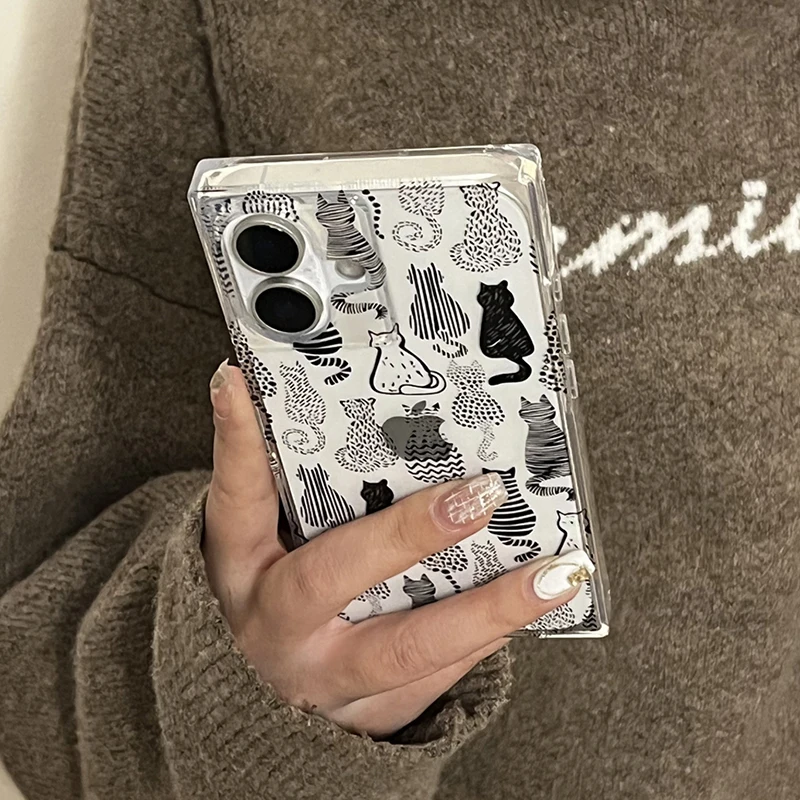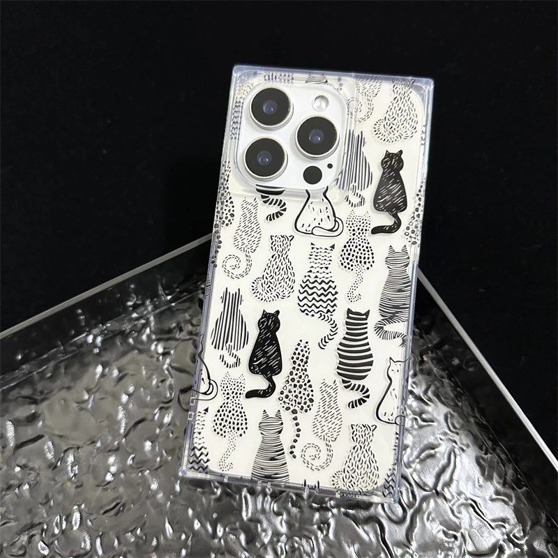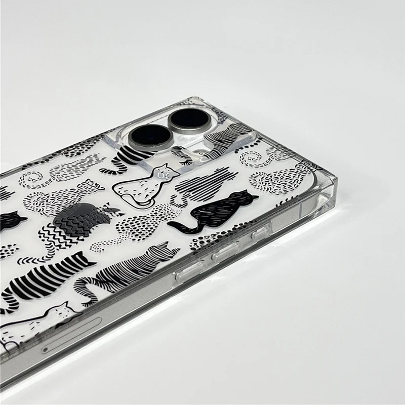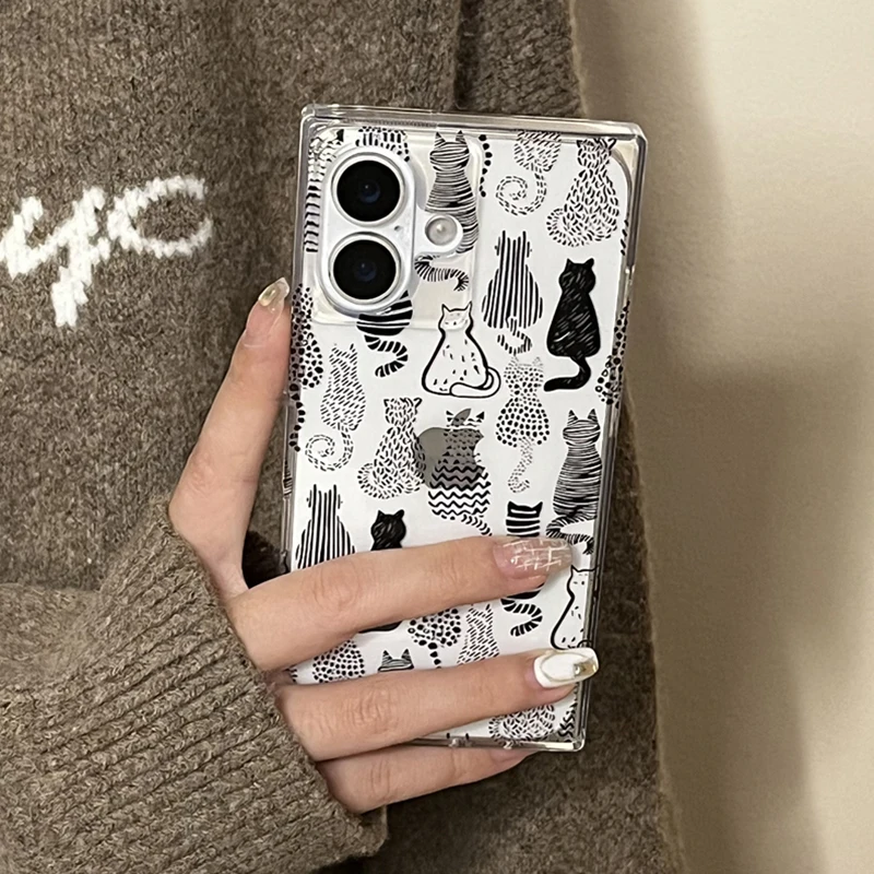 Cartoon Sketch Cats Pattern Right Angled Edge Case For iPhone 16 15 13 14 12 Pro Max Clear Phone Back Cover