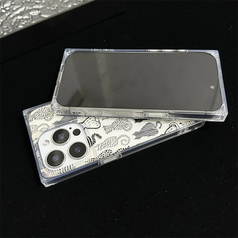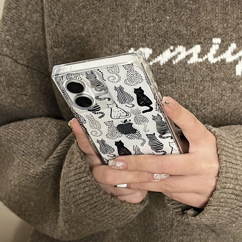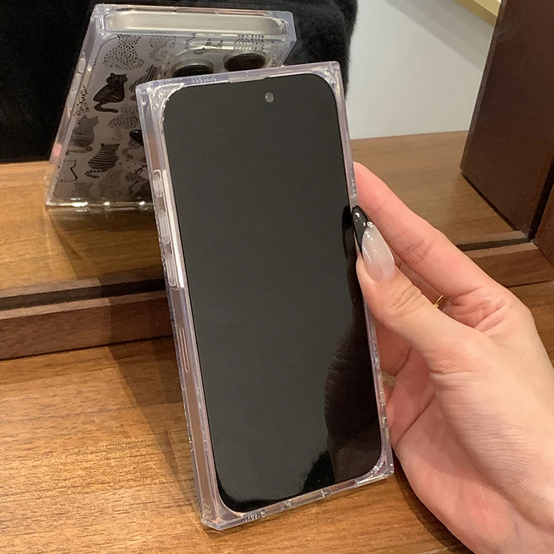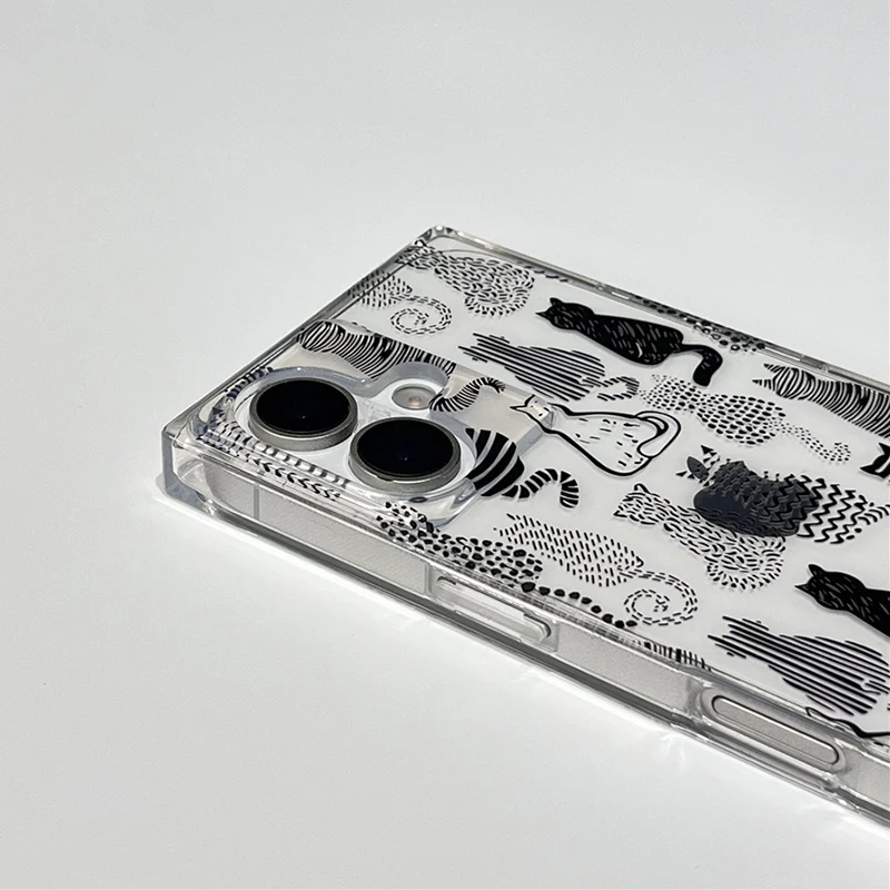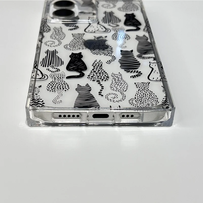 Cartoon Sketch Cats Pattern Right Angled Edge Case For iPhone 16 15 13 14 12 Pro Max Clear Phone Back Cover