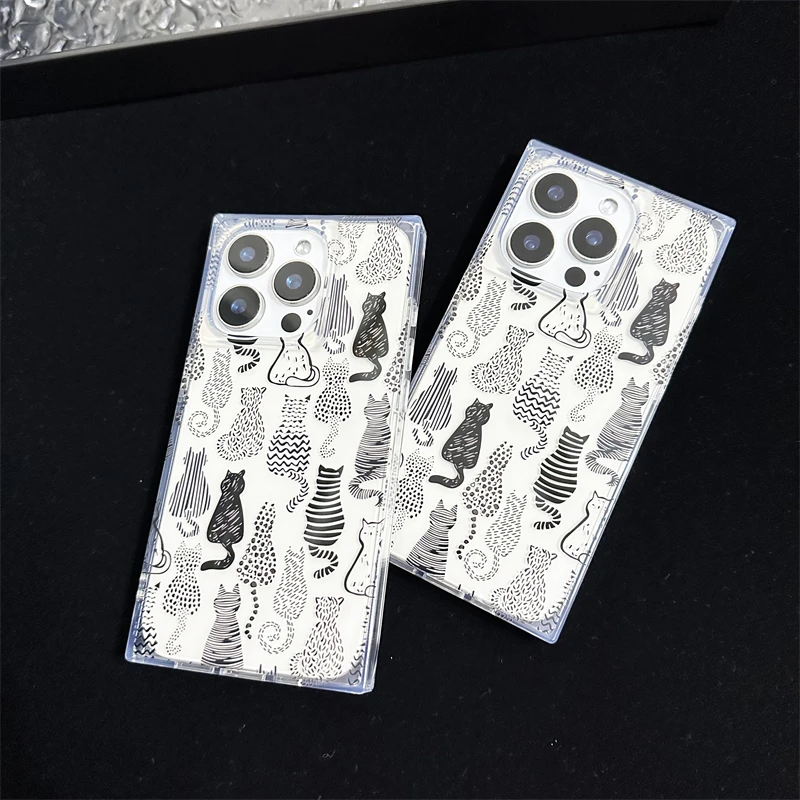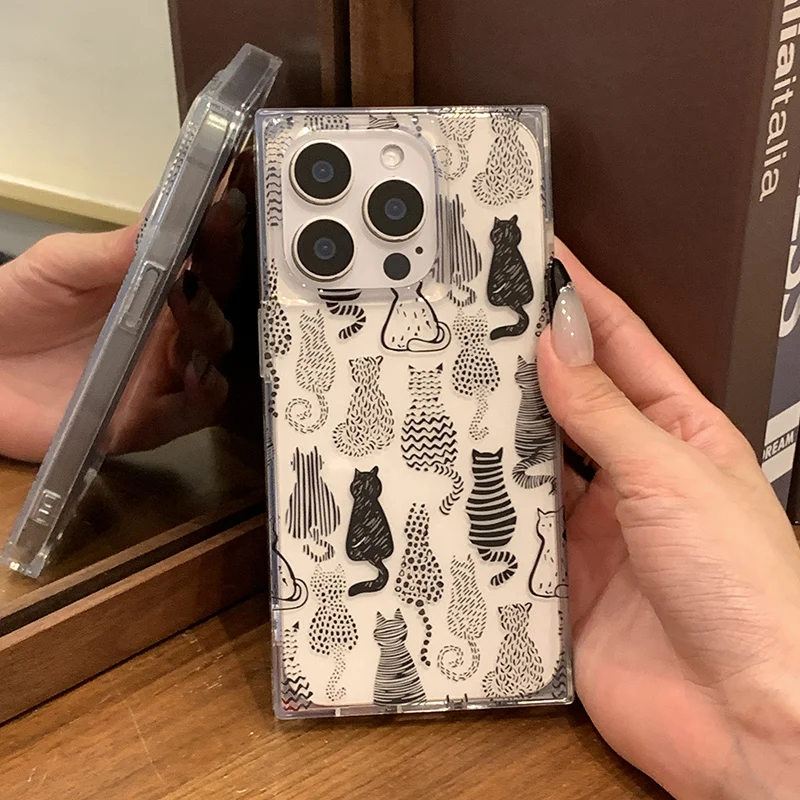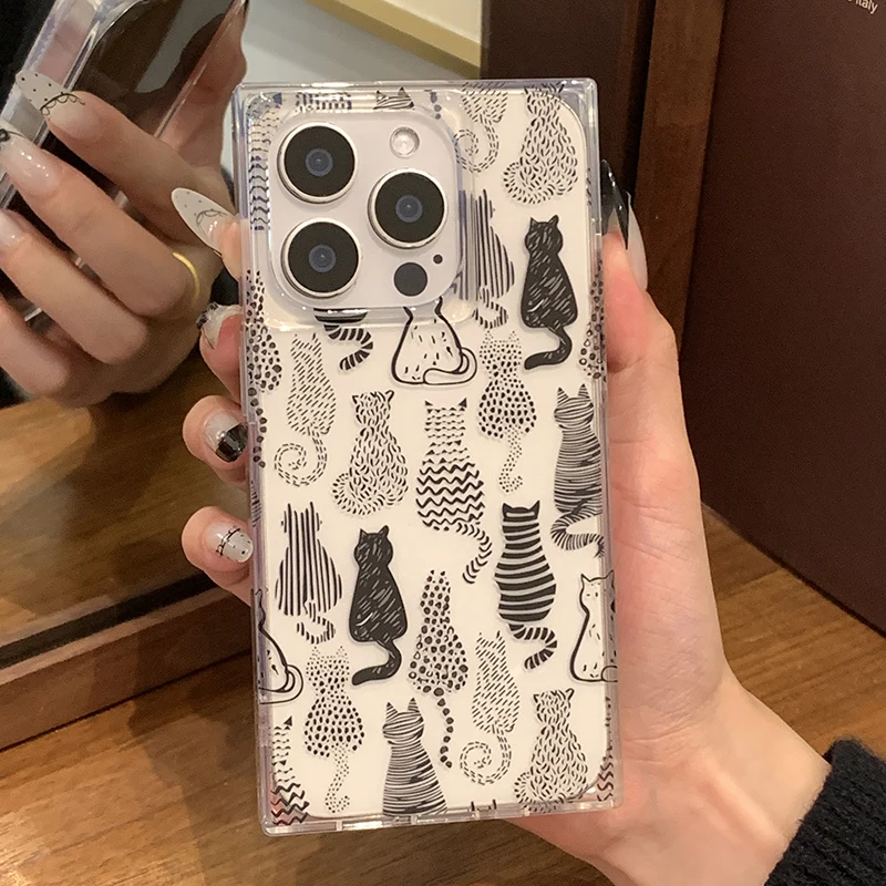 Comprar Funda con borde en ángulo recto con patrón de gatos y bocetos de dibujos animados para iPhone 16 15 13 14 12 Pro Max, funda trasera transparente para teléfono