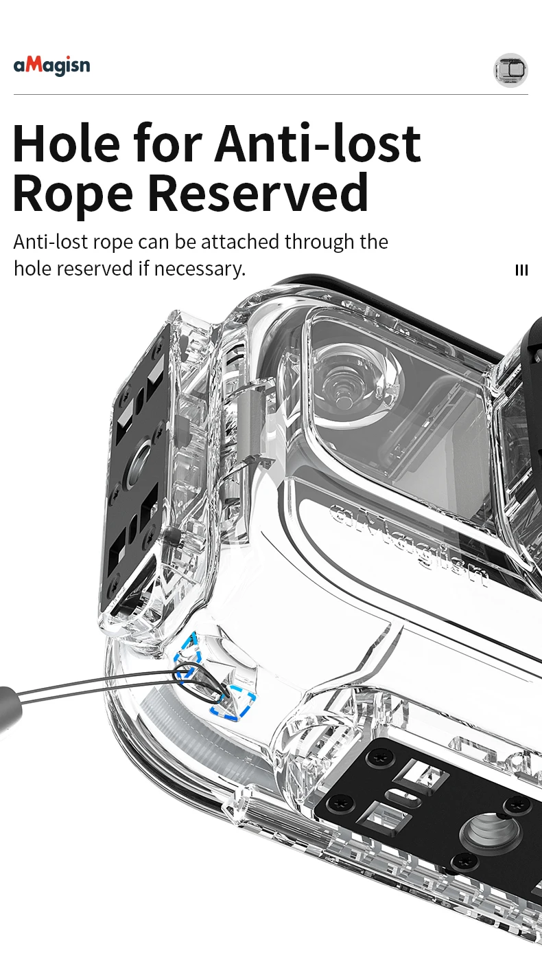 El cierre a presión deslizante es fácil de operar y firme, y el orificio para la cuerda antipérdida predeterminado evita que el dispositivo se caiga accidentalmente incluso cuando se aventurera bajo el agua.