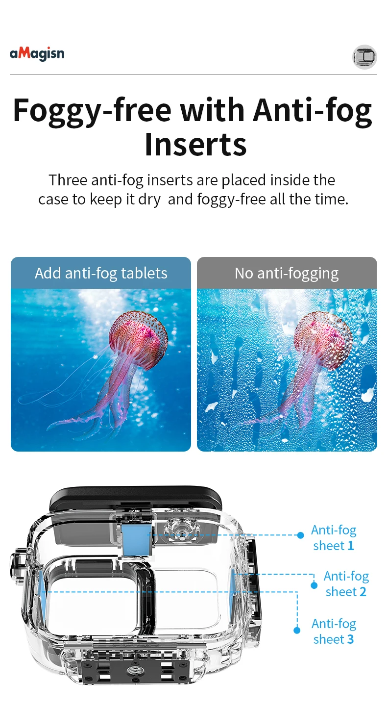 Los sellos de alta resistencia y las lentes reforzadas de 2,0 mm se combinan para hacer frente fácilmente a una presión de 60 metros bajo el agua, registrando cada momento de las maravillas marinas.